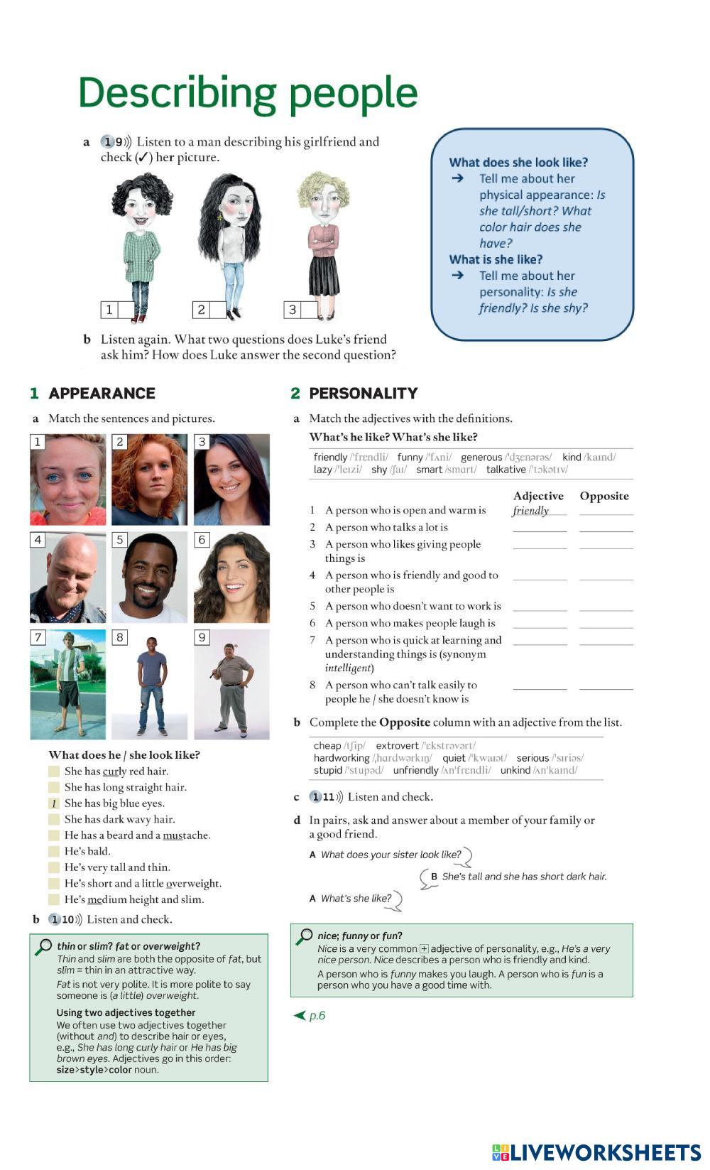 Created byFlorencia Velasco English 4th year - ESL Vocabulary to describe people Age 12+ level: Pre Intermediate Spanish คำแนะนำของผู้เขียน My Google Classroom Courses × 0 classes selected (0 students total) Quick Access Select all classes (0 classes) All Classes Loading courses... ยกเลิก Share Share to selected Course __COURSE_NAME__ __STUDENT_NAME__ (__STUDENT_EMAIL__) Vocabulary: Describing People ดาวน์โหลด Worksheet Validation Check my answers Emails my answers to my teacher ชื่อเต็ม Group/level School subject Teacher's email or key code Close ส่งข้อมูล Validating worksheet... (12) Your answers have been sent to your teacher. Good luck! OK We encountered an error submitting your answers. Please try again. OK โฆษณา | ใช้งานแบบไม่มีโฆษณา Created byFlorencia Velasco English 4th year - ESL Vocabulary to describe people Age 12+ level: Pre Intermediate Spanish คำแนะนำของผู้เขียน