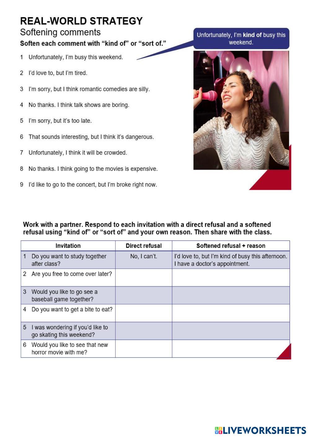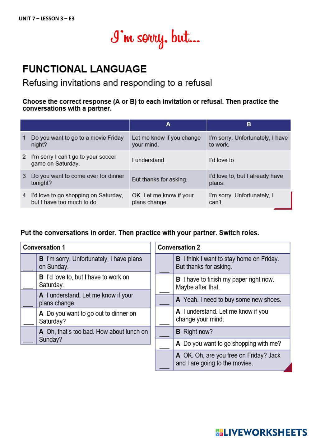 Created by Lizes English Refuse invitations and respond to refusals Age 18+ level: B1 Spanish คำแนะนำของผู้เขียน My Google Classroom Courses × 0 classes selected (0 students total) Quick Access Select all classes (0 classes) All Classes Loading courses... ยกเลิก Share Share to selected Course __COURSE_NAME__ __STUDENT_NAME__ (__STUDENT_EMAIL__) Lesson 3 - Unit 7 - E3 ดาวน์โหลด Worksheet Validation Check my answers Emails my answers to my teacher ชื่อเต็ม Group/level School subject Teacher's email or key code Close ส่งข้อมูล Validating worksheet... (12) Your answers have been sent to your teacher. Good luck! OK We encountered an error submitting your answers. Please try again. OK โฆษณา | ใช้งานแบบไม่มีโฆษณา Created by Lizes English Refuse invitations and respond to refusals Age 18+ level: B1 Spanish คำแนะนำของผู้เขียน
