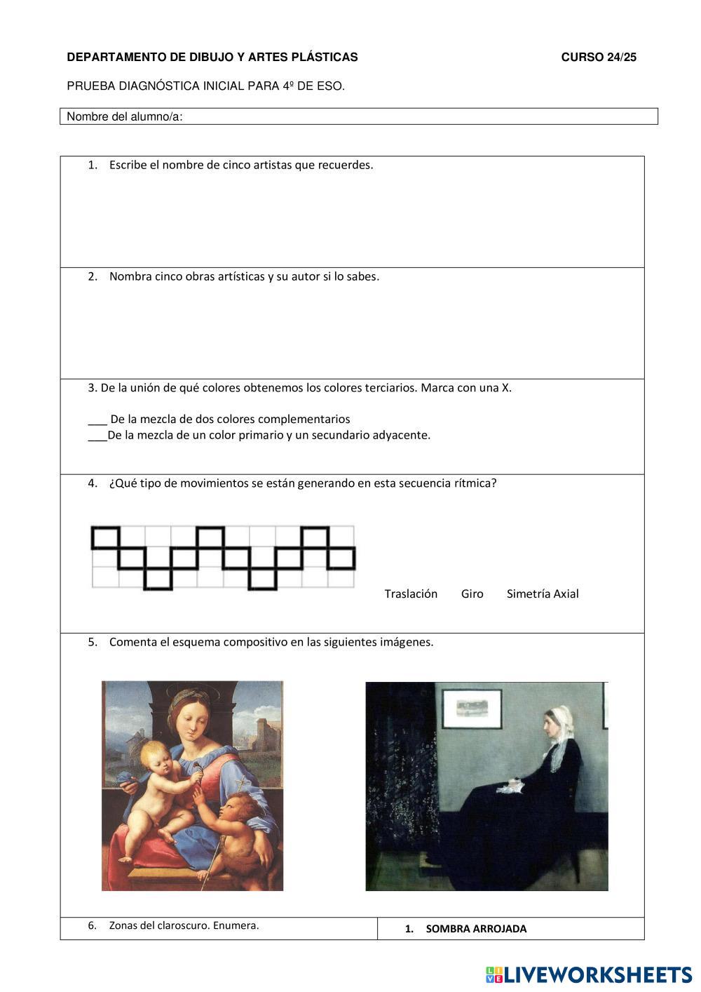 Created byJesus Rodríguez Morales Expresión Artística expresión artística Age 15+ level: medio Spanish คำแนะนำของผู้เขียน My Google Classroom Courses × 0 classes selected (0 students total) Quick Access Select all classes (0 classes) All Classes Loading courses... ยกเลิก Share Share to selected Course __COURSE_NAME__ __STUDENT_NAME__ (__STUDENT_EMAIL__) Ficha 1 ดาวน์โหลด Worksheet Validation Check my answers Emails my answers to my teacher ชื่อเต็ม Group/level School subject Teacher's email or key code Close ส่งข้อมูล Validating worksheet... (12) Your answers have been sent to your teacher. Good luck! OK We encountered an error submitting your answers. Please try again. OK โฆษณา | ใช้งานแบบไม่มีโฆษณา Created byJesus Rodríguez Morales Expresión Artística expresión artística Age 15+ level: medio Spanish คำแนะนำของผู้เขียน