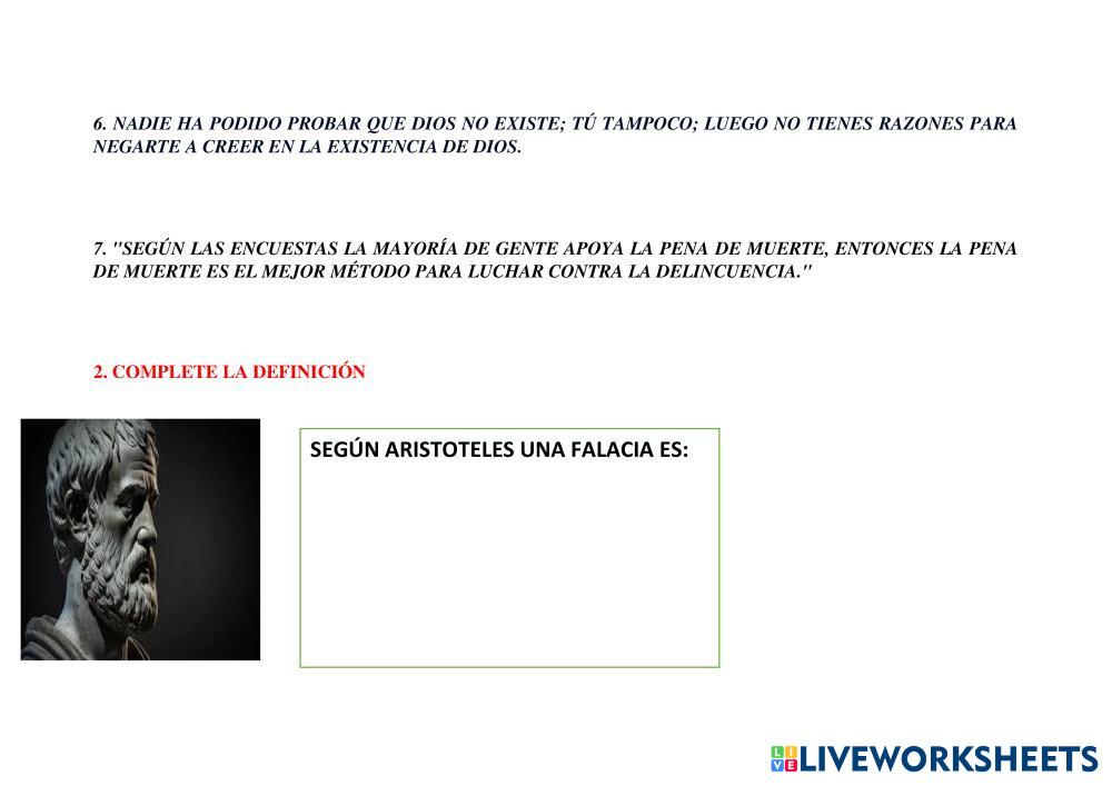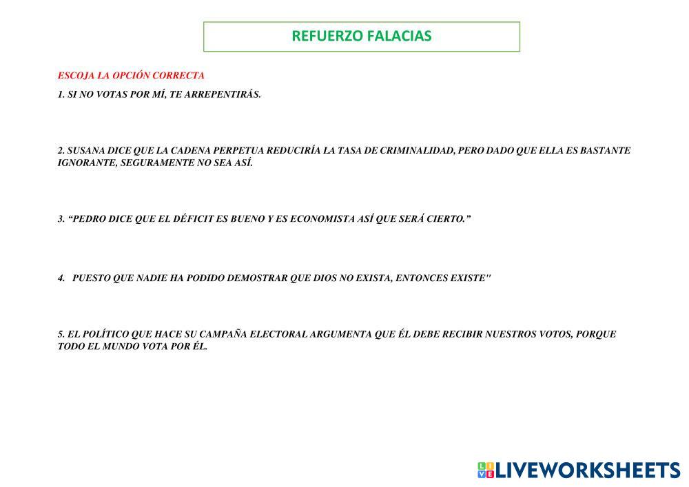 Created byDarío Mendieta filosofia ESCOGER Age 16+ level: 1 Spanish คำแนะนำของผู้เขียน My Google Classroom Courses × 0 classes selected (0 students total) Quick Access Select all classes (0 classes) All Classes Loading courses... ยกเลิก Share Share to selected Course __COURSE_NAME__ __STUDENT_NAME__ (__STUDENT_EMAIL__) Refuerzo falacias ดาวน์โหลด Worksheet Validation Check my answers Emails my answers to my teacher ชื่อเต็ม Group/level School subject Teacher's email or key code Close ส่งข้อมูล Validating worksheet... (12) Your answers have been sent to your teacher. Good luck! OK We encountered an error submitting your answers. Please try again. OK โฆษณา | ใช้งานแบบไม่มีโฆษณา Created byDarío Mendieta filosofia ESCOGER Age 16+ level: 1 Spanish คำแนะนำของผู้เขียน