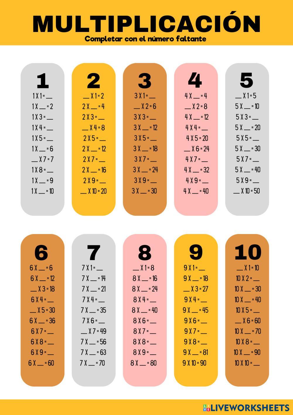 Tablas de multiplicar del 1 al 10 para que los estudiantes de escuela primaria practiquen la multiplicación. Esta worksheet les permite desarrollar sus habilidades matemáticas.