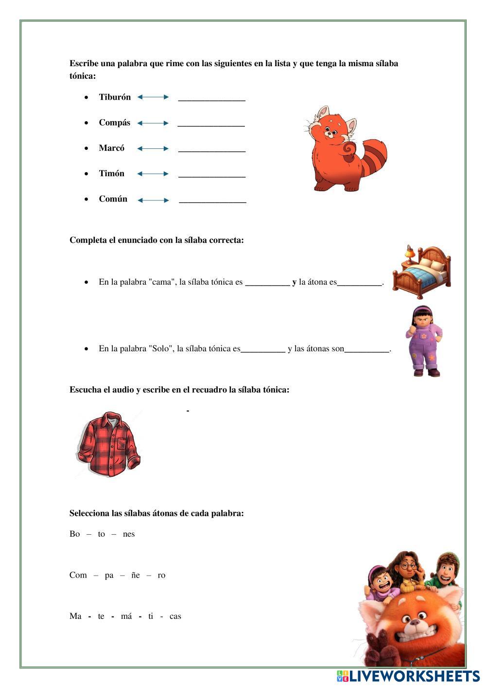 Created byAbigail Muriel Lengua y Literatura Conectores, palabras tonicas y atonas Age 7-12 level: 5to Spanish คำแนะนำของผู้เขียน My Google Classroom Courses × 0 classes selected (0 students total) Quick Access Select all classes (0 classes) All Classes Loading courses... ยกเลิก Share Share to selected Course __COURSE_NAME__ __STUDENT_NAME__ (__STUDENT_EMAIL__) Sílaba tónica y átona ดาวน์โหลด Worksheet Validation Check my answers Emails my answers to my teacher ชื่อเต็ม Group/level School subject Teacher's email or key code Close ส่งข้อมูล Validating worksheet... (12) Your answers have been sent to your teacher. Good luck! OK We encountered an error submitting your answers. Please try again. OK โฆษณา | ใช้งานแบบไม่มีโฆษณา Created byAbigail Muriel Lengua y Literatura Conectores, palabras tonicas y atonas Age 7-12 level: 5to Spanish คำแนะนำของผู้เขียน