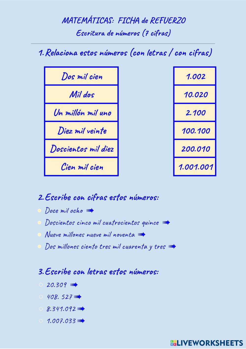 Escritura de números de 7 cifras con cifras y letras