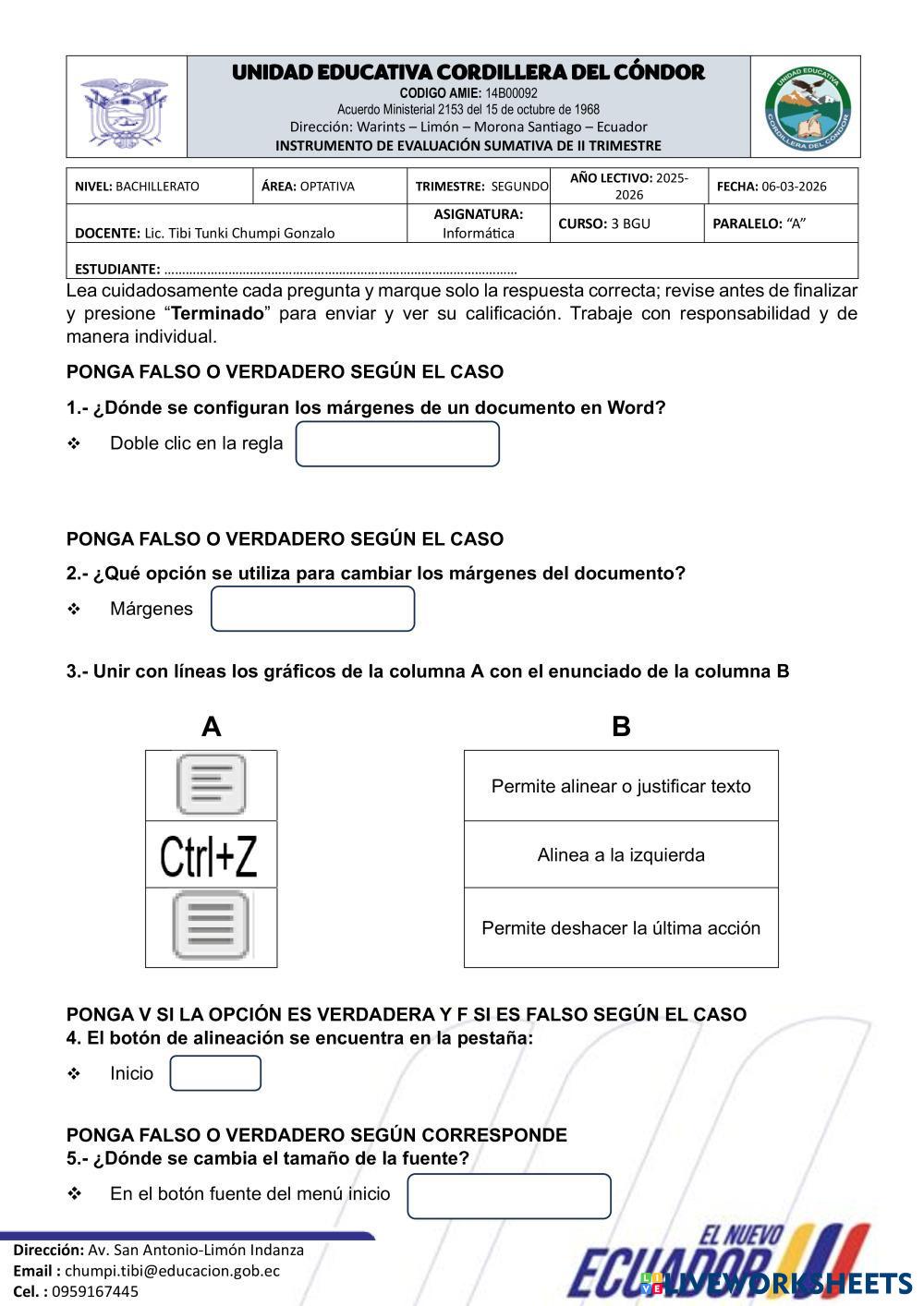 Lea cuidadosamente cada pregunta y marque solo la respuesta correcta; revise antes de finalizar y presione “Terminado” para enviar y ver su calificación. Trabaje con responsabilidad y de manera individual.