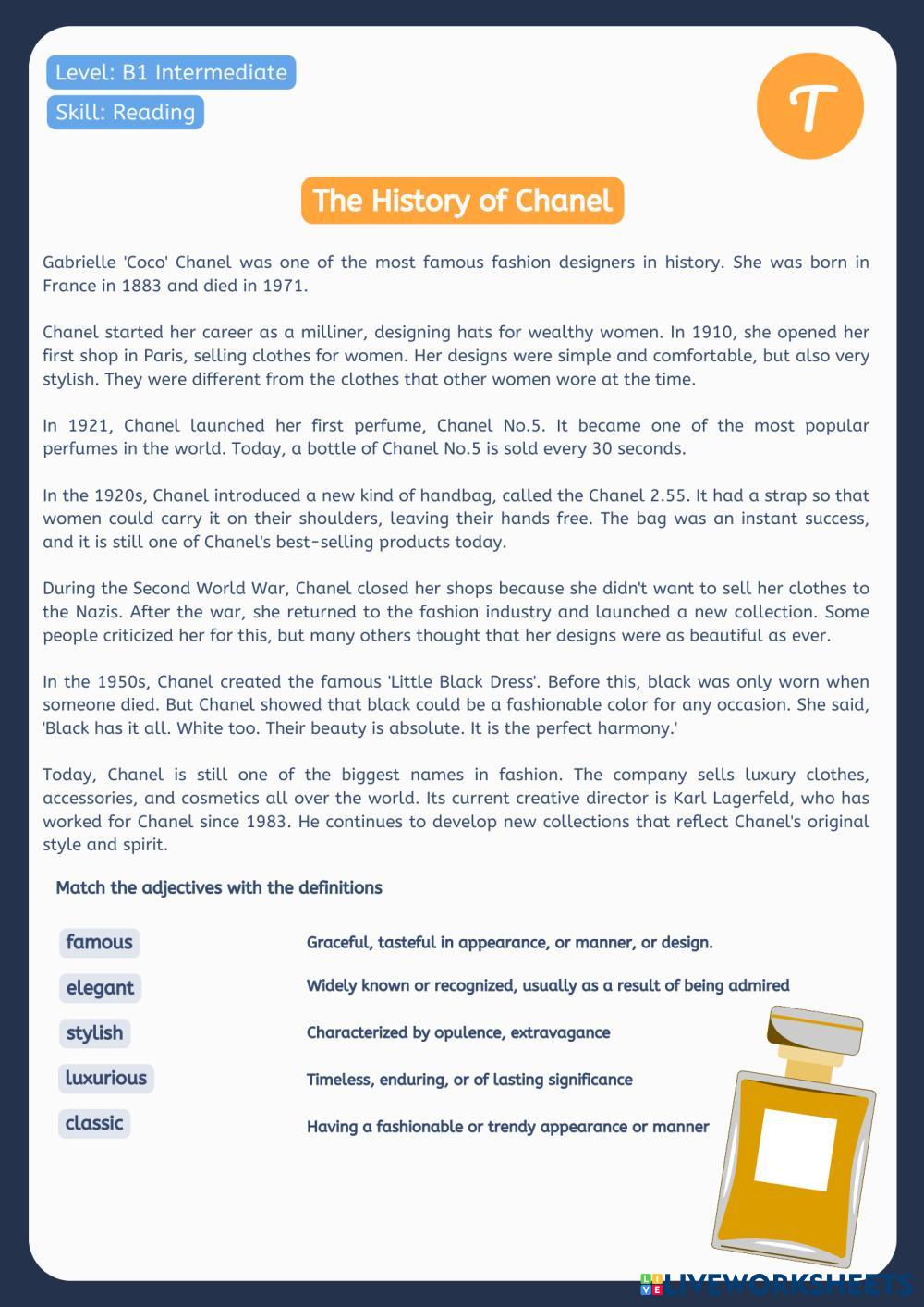 Created by Thinkie Reading Comprehension Thinkie Age 18+ level: B1 English Author's Instructions My Google Classroom Courses × 0 classes selected (0 students total) Quick Access Select all classes (0 classes) All Classes Loading courses... ยกเลิก Share Share to selected Course __COURSE_NAME__ __STUDENT_NAME__ (__STUDENT_EMAIL__) B1 Reading: The History of Chanel ดาวน์โหลด Worksheet Validation Check my answers Emails my answers to my teacher ชื่อเต็ม Group/level School subject Teacher's email or key code Close ส่งข้อมูล Validating worksheet... (12) Your answers have been sent to your teacher. Good luck! OK We encountered an error submitting your answers. Please try again. OK โฆษณา | ใช้งานแบบไม่มีโฆษณา Created by Thinkie Reading Comprehension Thinkie Age 18+ level: B1 English Author's Instructions