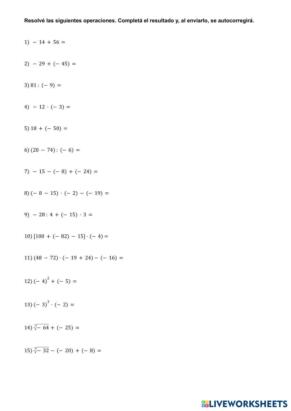 Created byMaria Soledad Di Paolo Números enteros Operaciones Age 12-16 level: 8th grade Spanish คำแนะนำของผู้เขียน My Google Classroom Courses × 0 classes selected (0 students total) Quick Access Select all classes (0 classes) All Classes Loading courses... ยกเลิก Share Share to selected Course __COURSE_NAME__ __STUDENT_NAME__ (__STUDENT_EMAIL__) Operaciones con números enteros ดาวน์โหลด Worksheet Validation Check my answers Emails my answers to my teacher ชื่อเต็ม Group/level School subject Teacher's email or key code Close ส่งข้อมูล Validating worksheet... (12) Your answers have been sent to your teacher. Good luck! OK We encountered an error submitting your answers. Please try again. OK โฆษณา | ใช้งานแบบไม่มีโฆษณา Created byMaria Soledad Di Paolo Números enteros Operaciones Age 12-16 level: 8th grade Spanish คำแนะนำของผู้เขียน