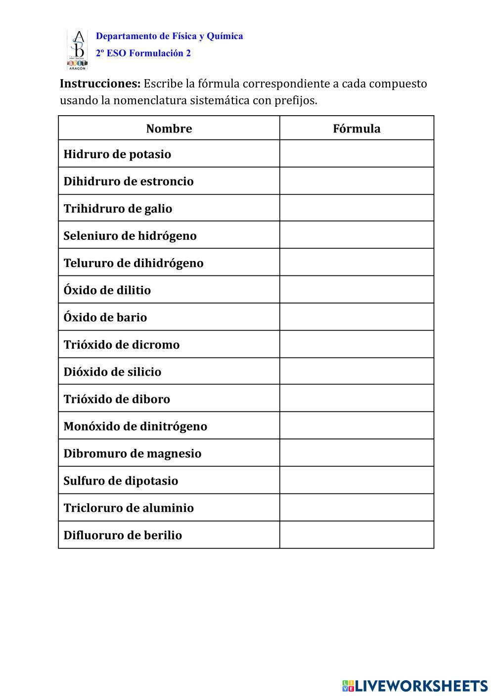 Escribe la fórmula correspondiente a cada compuesto usando la nomenclatura sistemática con prefijos.