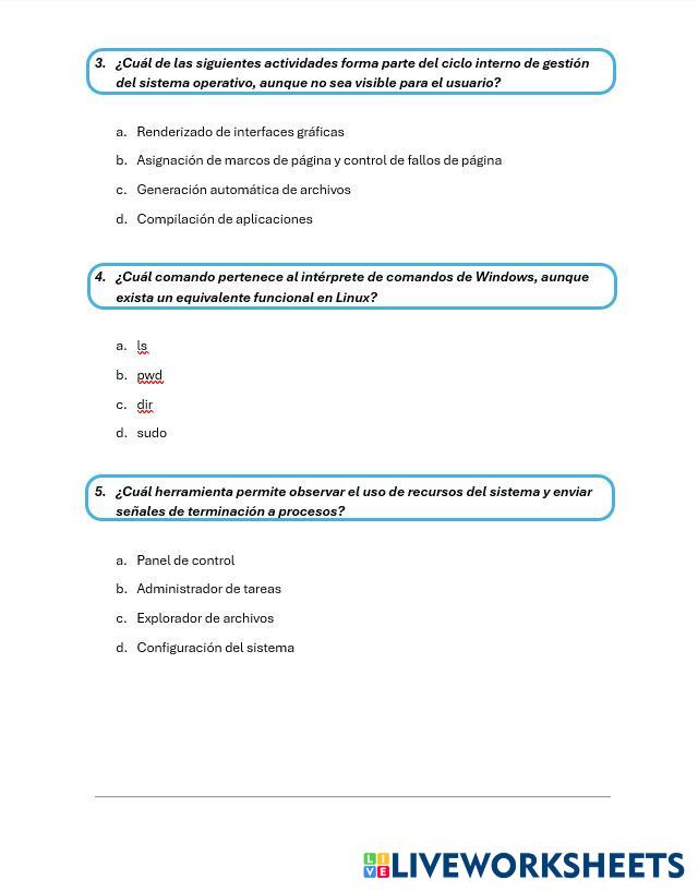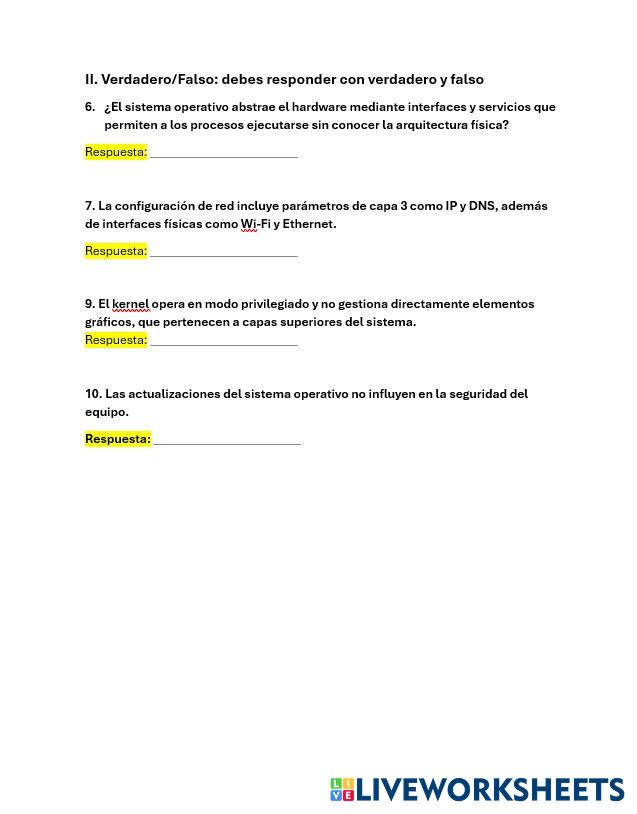 Esta actividad tiene como objetivo evaluar tu comprensión sobre los sistemas operativos, sus componentes, funciones y herramientas. Debes responder cada sección siguiendo las indicaciones: