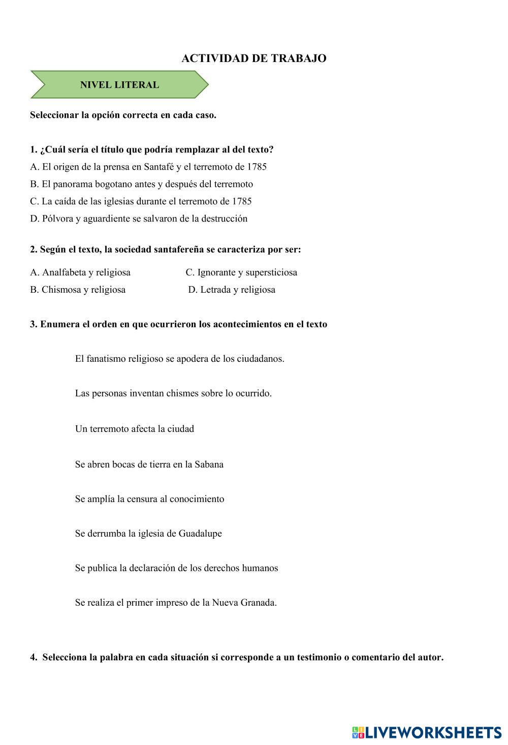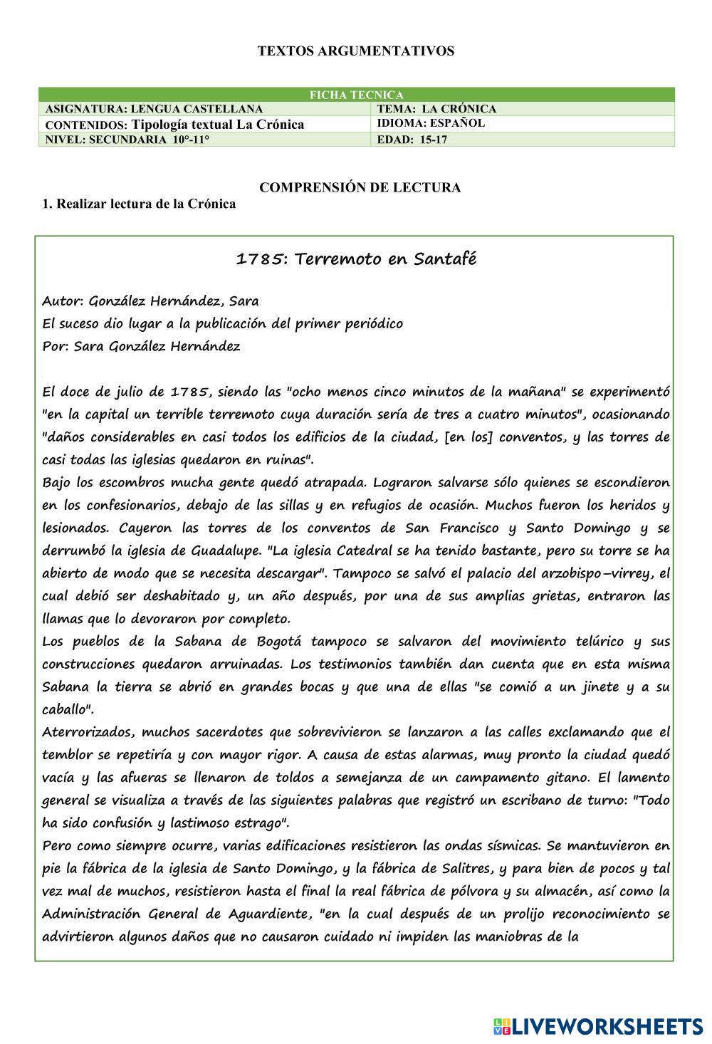 Created byLaura Marcela Casallas Guarín TIPOLOGÍA TEXTUAL LA CRÓNICA Age 15+ level: DÉCIMO Y UNDÉCIMO Spanish คำแนะนำของผู้เขียน My Google Classroom Courses × 0 classes selected (0 students total) Quick Access Select all classes (0 classes) All Classes Loading courses... ยกเลิก Share Share to selected Course __COURSE_NAME__ __STUDENT_NAME__ (__STUDENT_EMAIL__) GUÍA LA CRÓNICA ดาวน์โหลด Worksheet Validation Check my answers Emails my answers to my teacher ชื่อเต็ม Group/level School subject Teacher's email or key code Close ส่งข้อมูล Validating worksheet... (12) Your answers have been sent to your teacher. Good luck! OK We encountered an error submitting your answers. Please try again. OK โฆษณา | ใช้งานแบบไม่มีโฆษณา Created byLaura Marcela Casallas Guarín TIPOLOGÍA TEXTUAL LA CRÓNICA Age 15+ level: DÉCIMO Y UNDÉCIMO Spanish คำแนะนำของผู้เขียน
