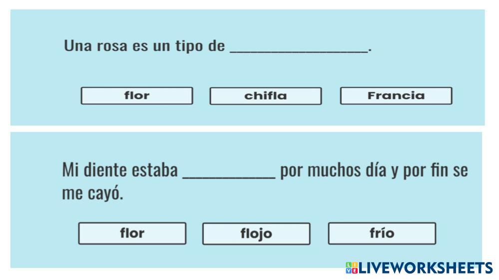 Created byKaren Coronel VOCABULARIO Vocabulario en español Age 4-13 level: basico Spanish คำแนะนำของผู้เขียน My Google Classroom Courses × 0 classes selected (0 students total) Quick Access Select all classes (0 classes) All Classes Loading courses... ยกเลิก Share Share to selected Course __COURSE_NAME__ __STUDENT_NAME__ (__STUDENT_EMAIL__) Palabras fl y fr ดาวน์โหลด Worksheet Validation Check my answers Emails my answers to my teacher ชื่อเต็ม Group/level School subject Teacher's email or key code Close ส่งข้อมูล Validating worksheet... (12) Your answers have been sent to your teacher. Good luck! OK We encountered an error submitting your answers. Please try again. OK โฆษณา | ใช้งานแบบไม่มีโฆษณา Created byKaren Coronel VOCABULARIO Vocabulario en español Age 4-13 level: basico Spanish คำแนะนำของผู้เขียน
