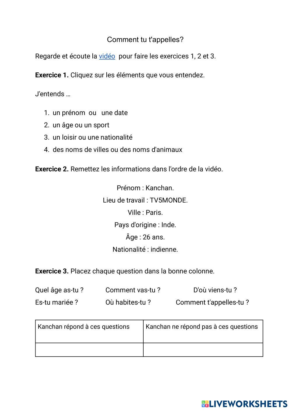 Created by ifarres Français Langue Étrangère (FLE) Se présenter en français -2 Age 12-16 level: 1ESO French คำแนะนำของผู้เขียน Poser des questions, répondre, pour se présenter My Google Classroom Courses × 0 classes selected (0 students total) Quick Access Select all classes (0 classes) All Classes Loading courses... ยกเลิก Share Share to selected Course __COURSE_NAME__ __STUDENT_NAME__ (__STUDENT_EMAIL__) Comment tu t'appelles? ดาวน์โหลด Worksheet Validation Check my answers Emails my answers to my teacher ชื่อเต็ม Group/level School subject Teacher's email or key code Close ส่งข้อมูล Validating worksheet... (12) Your answers have been sent to your teacher. Good luck! OK We encountered an error submitting your answers. Please try again. OK โฆษณา | ใช้งานแบบไม่มีโฆษณา Created by ifarres Français Langue Étrangère (FLE) Se présenter en français -2 Age 12-16 level: 1ESO French คำแนะนำของผู้เขียน Poser des questions, répondre, pour se présenter
