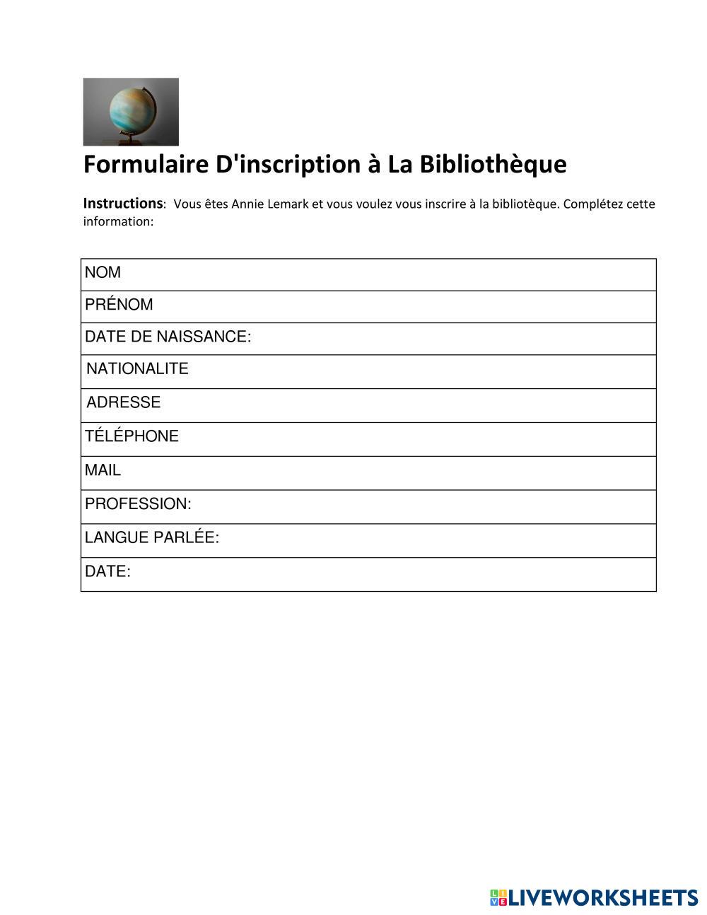 Vous êtes Annie Lemark et vous voulez vous inscrire à la bibliotèque. Complétez cette information: