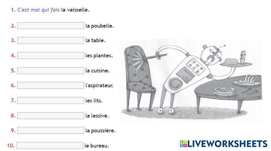Created by Helene1 Tâches ménagères Les tâches ménagères Age 13+ level: 4º eso French คำแนะนำของผู้เขียน My Google Classroom Courses × 0 classes selected (0 students total) Quick Access Select all classes (0 classes) All Classes Loading courses... ยกเลิก Share Share to selected Course __COURSE_NAME__ __STUDENT_NAME__ (__STUDENT_EMAIL__) Les tâches ménagères et la mise en relief ดาวน์โหลด Worksheet Validation Check my answers Emails my answers to my teacher ชื่อเต็ม Group/level School subject Teacher's email or key code Close ส่งข้อมูล Validating worksheet... (12) Your answers have been sent to your teacher. Good luck! OK We encountered an error submitting your answers. Please try again. OK โฆษณา | ใช้งานแบบไม่มีโฆษณา Created by Helene1 Tâches ménagères Les tâches ménagères Age 13+ level: 4º eso French คำแนะนำของผู้เขียน