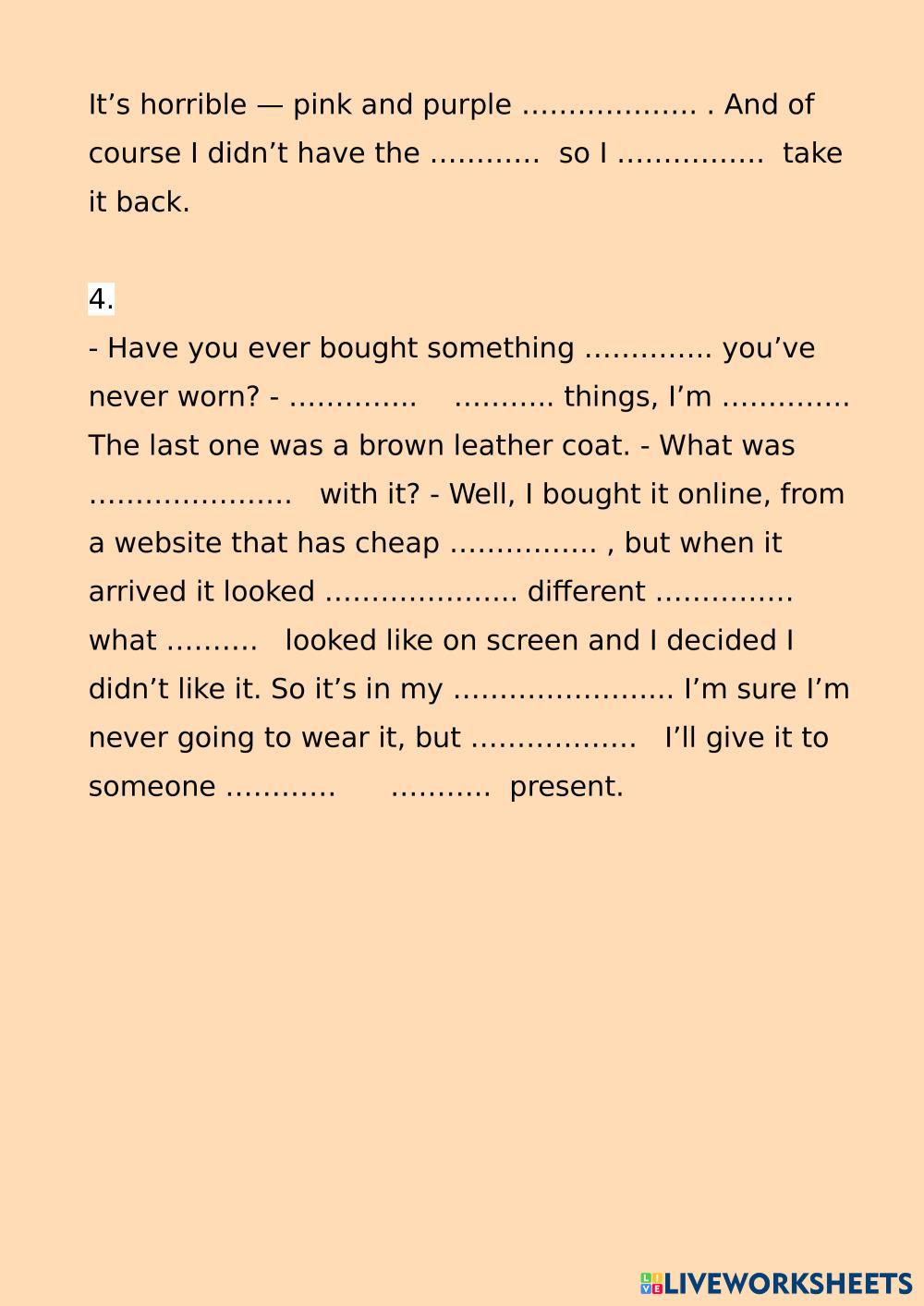 Created by DV2021 English as a Second Language (ESL) gap fill Age 14+ level: A2 Hungarian Author's Instructions My Google Classroom Courses × 0 classes selected (0 students total) Quick Access Select all classes (0 classes) All Classes Loading courses... ยกเลิก Share Share to selected Course __COURSE_NAME__ __STUDENT_NAME__ (__STUDENT_EMAIL__) shopping online ดาวน์โหลด Worksheet Validation Check my answers Emails my answers to my teacher ชื่อเต็ม Group/level School subject Teacher's email or key code Close ส่งข้อมูล Validating worksheet... (12) Your answers have been sent to your teacher. Good luck! OK We encountered an error submitting your answers. Please try again. OK โฆษณา | ใช้งานแบบไม่มีโฆษณา Created by DV2021 English as a Second Language (ESL) gap fill Age 14+ level: A2 Hungarian Author's Instructions