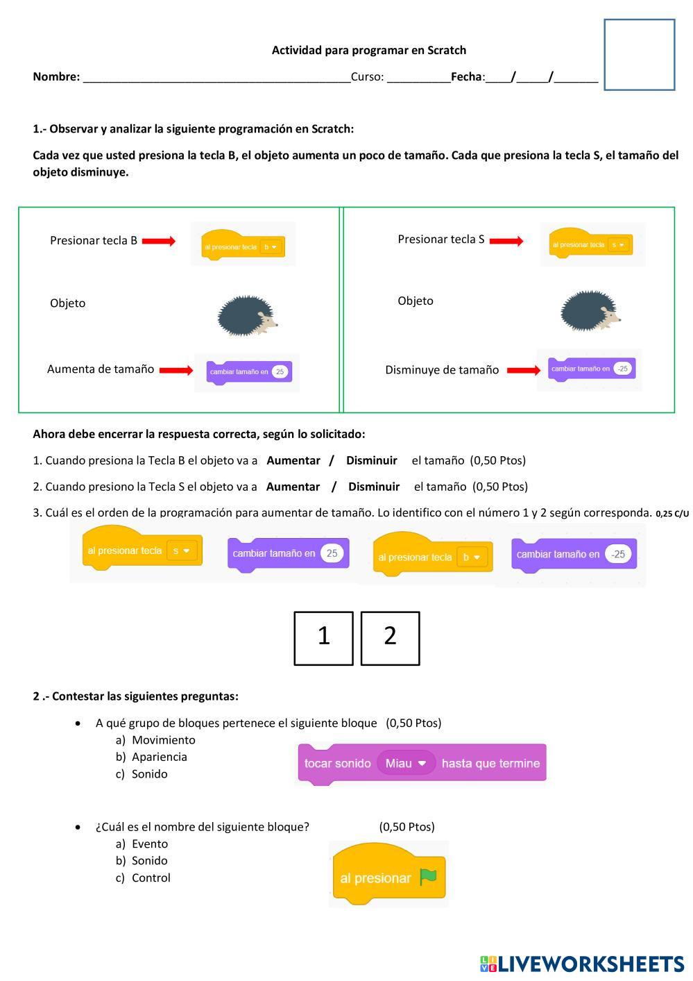 Created by A_Torres Bloques de scratch Reconocer bloques de Scratch Age 13-18 level: 8vo básica Spanish Author's Instructions My Google Classroom Courses × 0 classes selected (0 students total) Quick Access Select all classes (0 classes) All Classes Loading courses... ยกเลิก Share Share to selected Course __COURSE_NAME__ __STUDENT_NAME__ (__STUDENT_EMAIL__) Recordar bloques de programación Scratch ดาวน์โหลด Worksheet Validation Check my answers Emails my answers to my teacher ชื่อเต็ม Group/level School subject Teacher's email or key code Close ส่งข้อมูล Validating worksheet... (12) Your answers have been sent to your teacher. Good luck! OK We encountered an error submitting your answers. Please try again. OK โฆษณา | ใช้งานแบบไม่มีโฆษณา Created by A_Torres Bloques de scratch Reconocer bloques de Scratch Age 13-18 level: 8vo básica Spanish Author's Instructions