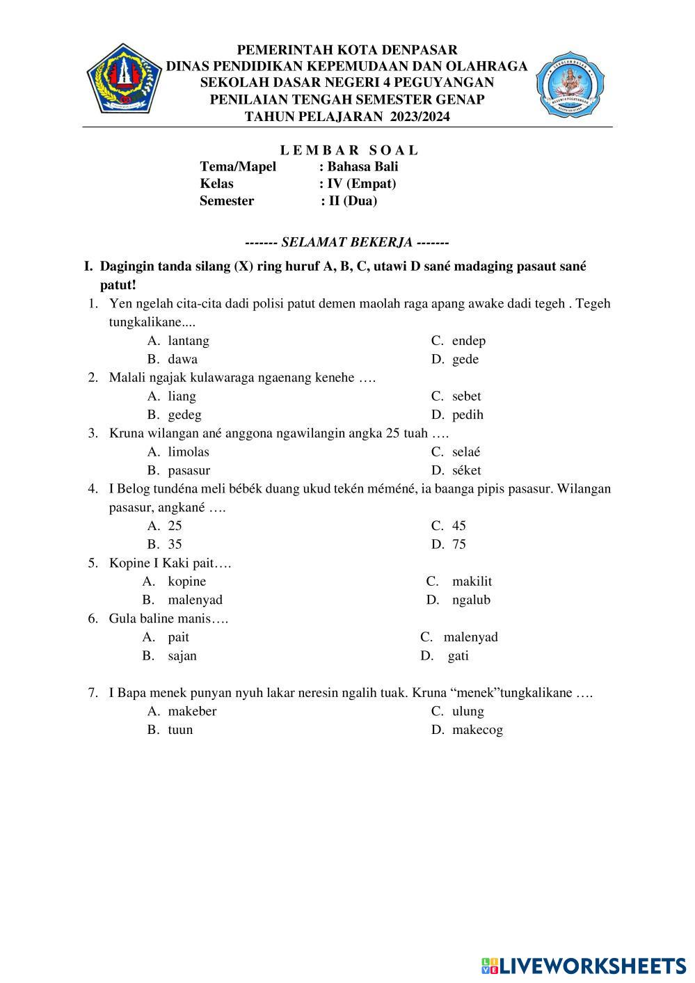 Created byEka Purnawan Bahasa Bali soal Age 4-7 level: 4 Indonesian คำแนะนำของผู้เขียน bahasa bali My Google Classroom Courses × 0 classes selected (0 students total) Quick Access Select all classes (0 classes) All Classes Loading courses... ยกเลิก Share Share to selected Course __COURSE_NAME__ __STUDENT_NAME__ (__STUDENT_EMAIL__) Bahasa Bali ดาวน์โหลด Worksheet Validation Check my answers Emails my answers to my teacher ชื่อเต็ม Group/level School subject Teacher's email or key code Close ส่งข้อมูล Validating worksheet... (12) Your answers have been sent to your teacher. Good luck! OK We encountered an error submitting your answers. Please try again. OK โฆษณา | ใช้งานแบบไม่มีโฆษณา Created byEka Purnawan Bahasa Bali soal Age 4-7 level: 4 Indonesian คำแนะนำของผู้เขียน bahasa bali