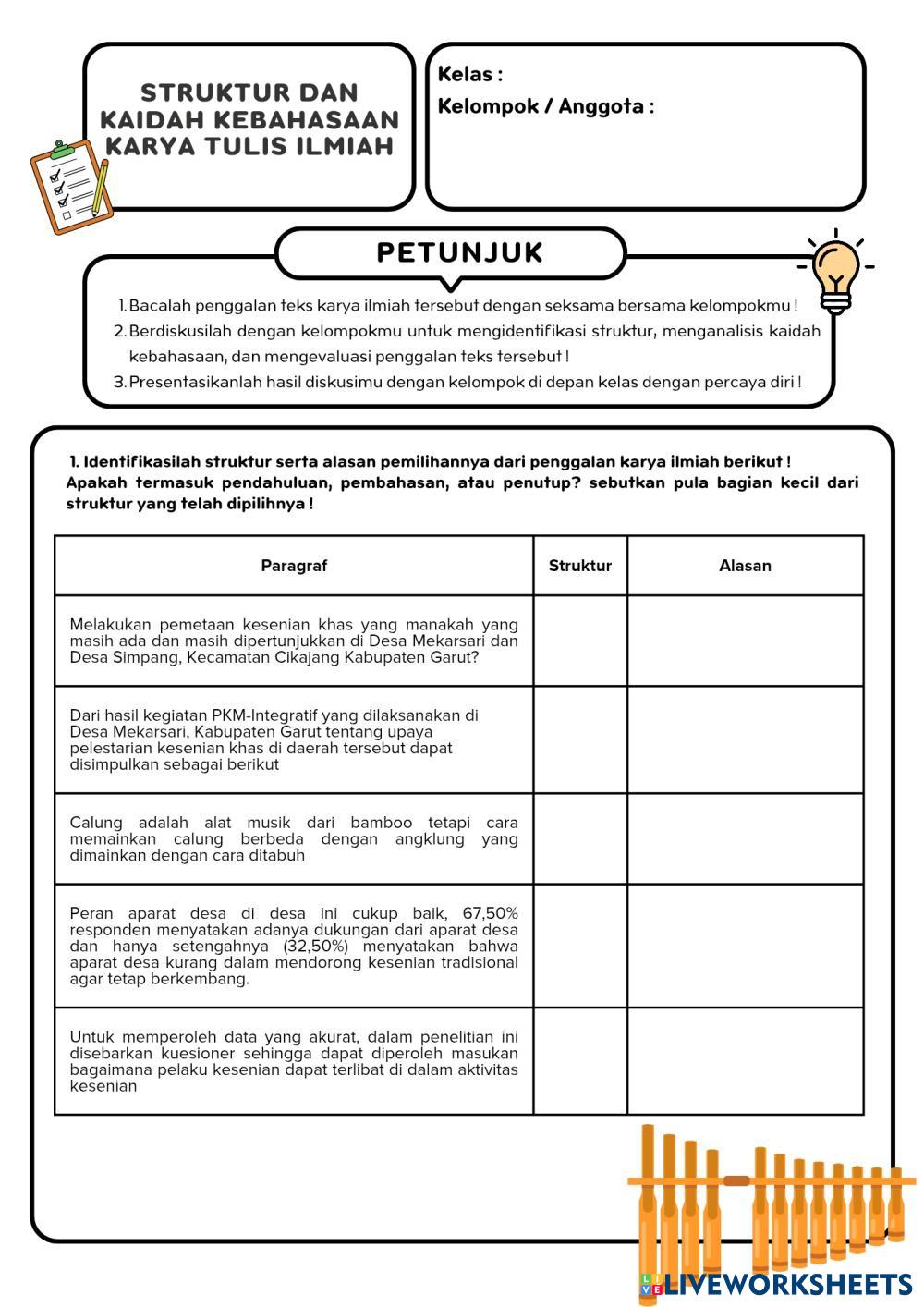 Lembar kerja untuk kelas XI materi Karya Tulis Ilmiah sub bab Struktur dan Kaidah Kebahasaan