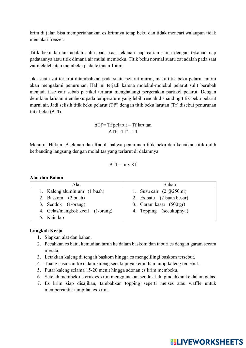 Created bynajdin aqmarina Kimia praktikum penuruna titik beku Age 17+ level: F Indonesian คำแนะนำของผู้เขียน My Google Classroom Courses × 0 classes selected (0 students total) Quick Access Select all classes (0 classes) All Classes Loading courses... ยกเลิก Share Share to selected Course __COURSE_NAME__ __STUDENT_NAME__ (__STUDENT_EMAIL__) LKPD PRAKTIKUM PENURUNAN TITIK BEKU PADA PEMBUATAN ES PUTAR ดาวน์โหลด Worksheet Validation Check my answers Emails my answers to my teacher ชื่อเต็ม Group/level School subject Teacher's email or key code Close ส่งข้อมูล Validating worksheet... (12) Your answers have been sent to your teacher. Good luck! OK We encountered an error submitting your answers. Please try again. OK โฆษณา | ใช้งานแบบไม่มีโฆษณา Created bynajdin aqmarina Kimia praktikum penuruna titik beku Age 17+ level: F Indonesian คำแนะนำของผู้เขียน