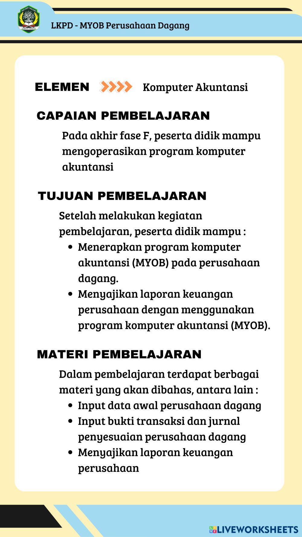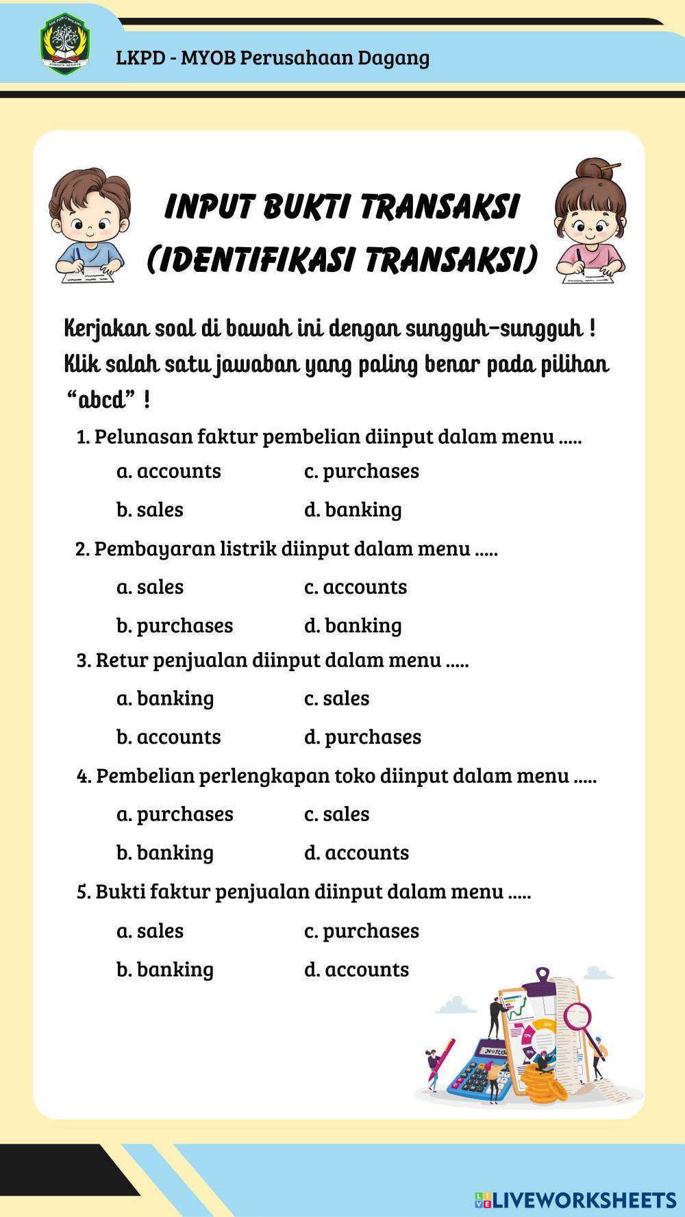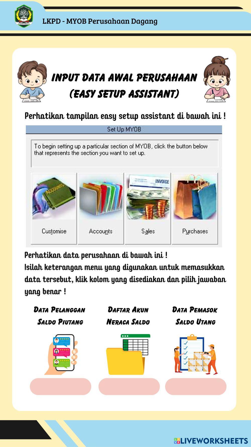 Created byJessica Marchelia Komputer Akuntansi Myob Age 15+ level: 11 Indonesian คำแนะนำของผู้เขียน My Google Classroom Courses × 0 classes selected (0 students total) Quick Access Select all classes (0 classes) All Classes Loading courses... ยกเลิก Share Share to selected Course __COURSE_NAME__ __STUDENT_NAME__ (__STUDENT_EMAIL__) LKPD MYOB-PERUSAHAAN DAGANG ดาวน์โหลด Worksheet Validation Check my answers Emails my answers to my teacher ชื่อเต็ม Group/level School subject Teacher's email or key code Close ส่งข้อมูล Validating worksheet... (12) Your answers have been sent to your teacher. Good luck! OK We encountered an error submitting your answers. Please try again. OK โฆษณา | ใช้งานแบบไม่มีโฆษณา Created byJessica Marchelia Komputer Akuntansi Myob Age 15+ level: 11 Indonesian คำแนะนำของผู้เขียน