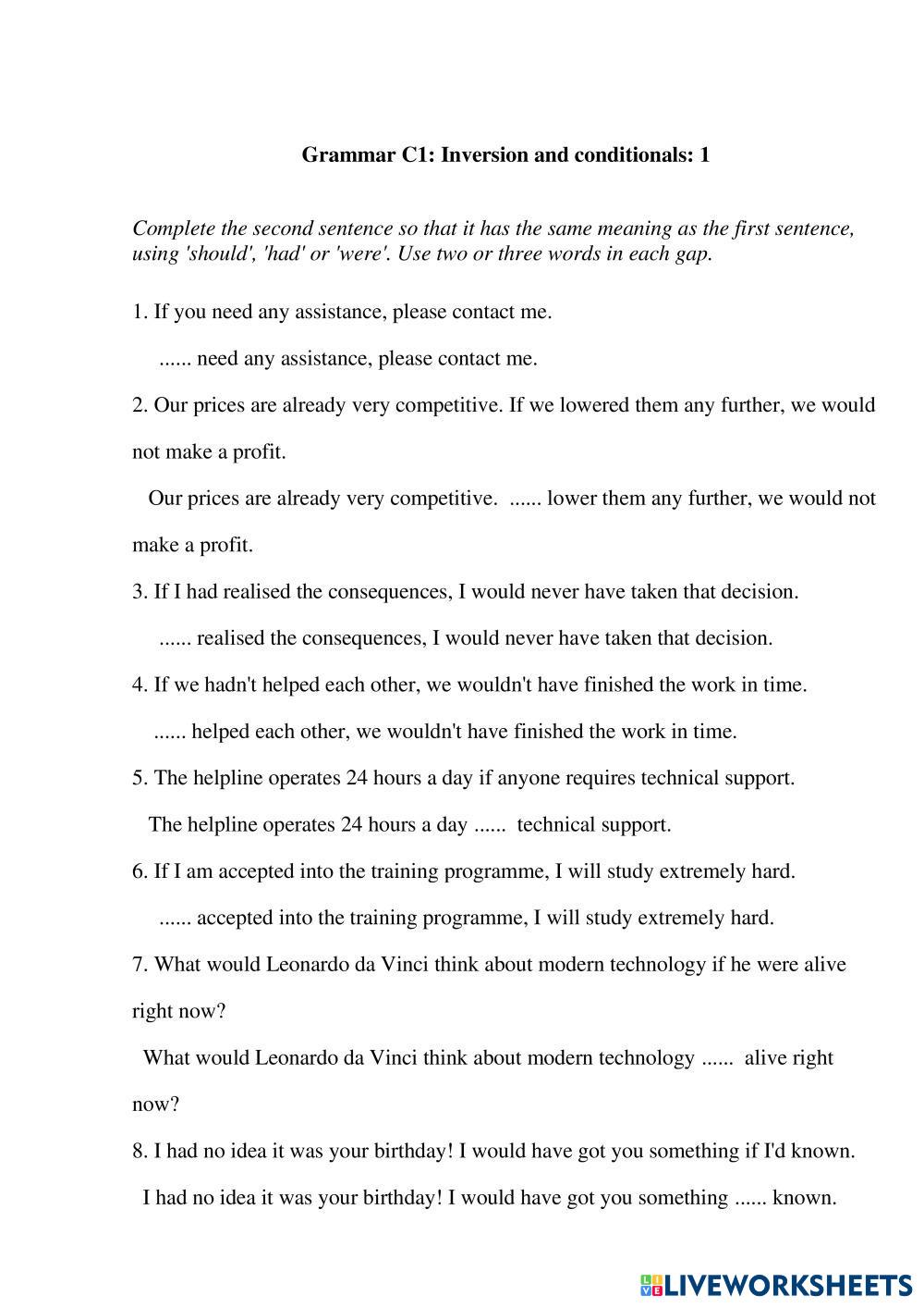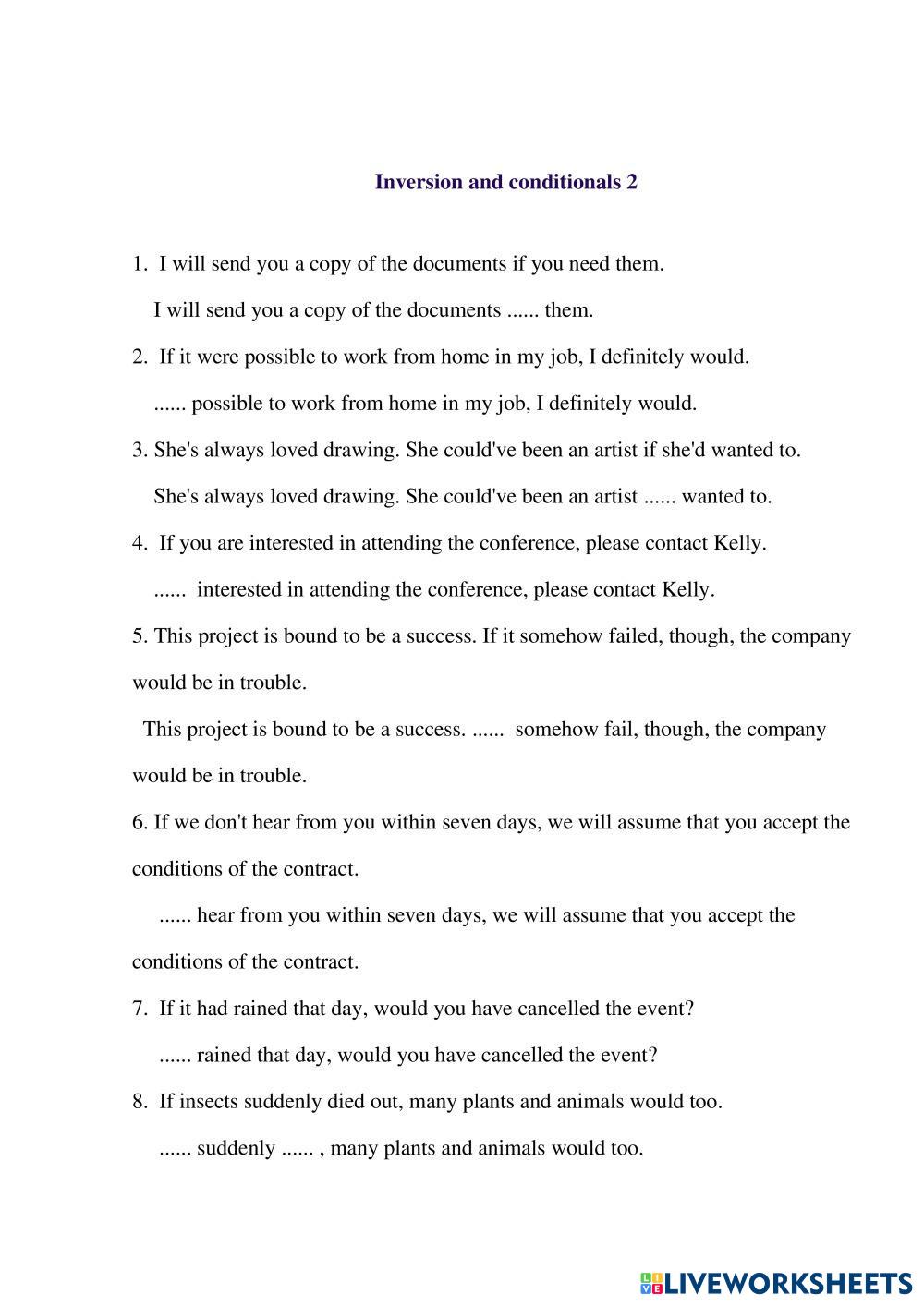 Created byReda English Grammar Age 15+ level: C1 English Author's Instructions My Google Classroom Courses × 0 classes selected (0 students total) Quick Access Select all classes (0 classes) All Classes Loading courses... ยกเลิก Share Share to selected Course __COURSE_NAME__ __STUDENT_NAME__ (__STUDENT_EMAIL__) Grammar C1 Inverted Conditionals ดาวน์โหลด Worksheet Validation Check my answers Emails my answers to my teacher ชื่อเต็ม Group/level School subject Teacher's email or key code Close ส่งข้อมูล Validating worksheet... (12) Your answers have been sent to your teacher. Good luck! OK We encountered an error submitting your answers. Please try again. OK โฆษณา | ใช้งานแบบไม่มีโฆษณา Created byReda English Grammar Age 15+ level: C1 English Author's Instructions
