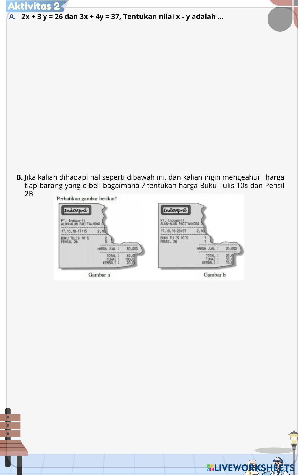 Created byFajar Rasyid Muqtafi Matematika SMP Kelas 8 Metode Eliminasi Age 11-18 level: SMP IX Indonesian คำแนะนำของผู้เขียน My Google Classroom Courses × 0 classes selected (0 students total) Quick Access Select all classes (0 classes) All Classes Loading courses... ยกเลิก Share Share to selected Course __COURSE_NAME__ __STUDENT_NAME__ (__STUDENT_EMAIL__) Pertemuan 4 eliminasi ดาวน์โหลด Worksheet Validation Check my answers Emails my answers to my teacher ชื่อเต็ม Group/level School subject Teacher's email or key code Close ส่งข้อมูล Validating worksheet... (12) Your answers have been sent to your teacher. Good luck! OK We encountered an error submitting your answers. Please try again. OK โฆษณา | ใช้งานแบบไม่มีโฆษณา Created byFajar Rasyid Muqtafi Matematika SMP Kelas 8 Metode Eliminasi Age 11-18 level: SMP IX Indonesian คำแนะนำของผู้เขียน