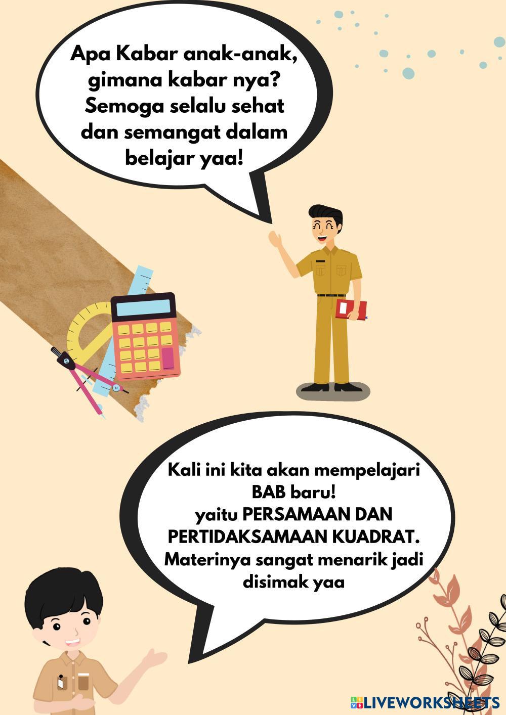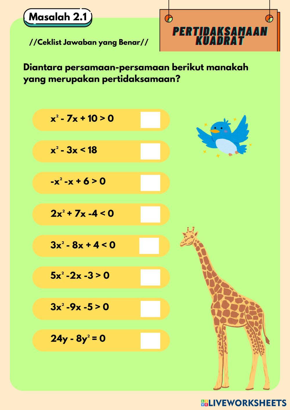 Created byRhilla Midia Safana Matematika Angka Age 10+ level: 3 Indonesian คำแนะนำของผู้เขียน My Google Classroom Courses × 0 classes selected (0 students total) Quick Access Select all classes (0 classes) All Classes Loading courses... ยกเลิก Share Share to selected Course __COURSE_NAME__ __STUDENT_NAME__ (__STUDENT_EMAIL__) Persamaan dan Pertidaksamaan Kuadrat ดาวน์โหลด Worksheet Validation Check my answers Emails my answers to my teacher ชื่อเต็ม Group/level School subject Teacher's email or key code Close ส่งข้อมูล Validating worksheet... (12) Your answers have been sent to your teacher. Good luck! OK We encountered an error submitting your answers. Please try again. OK โฆษณา | ใช้งานแบบไม่มีโฆษณา Created byRhilla Midia Safana Matematika Angka Age 10+ level: 3 Indonesian คำแนะนำของผู้เขียน