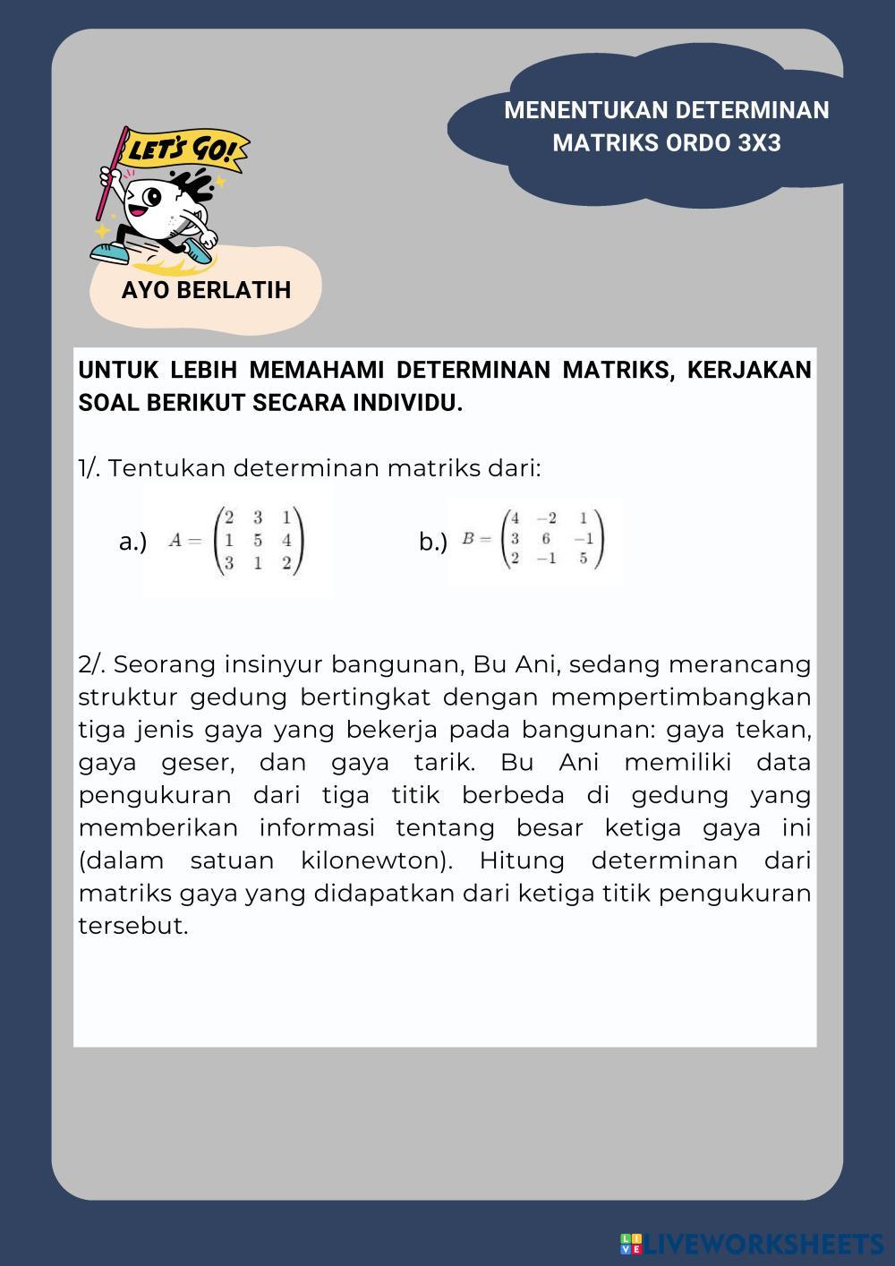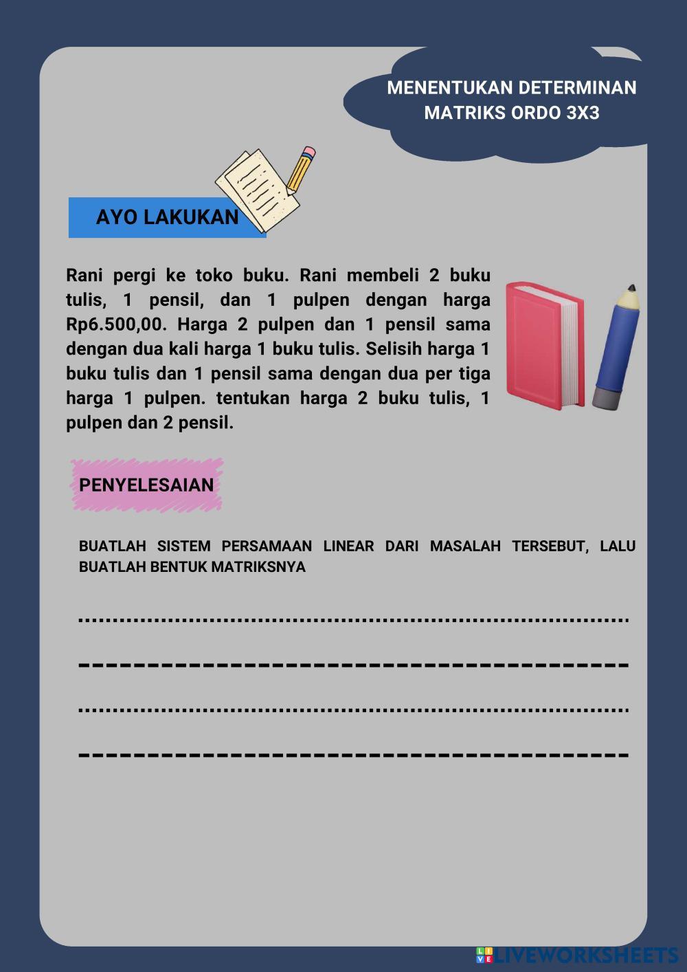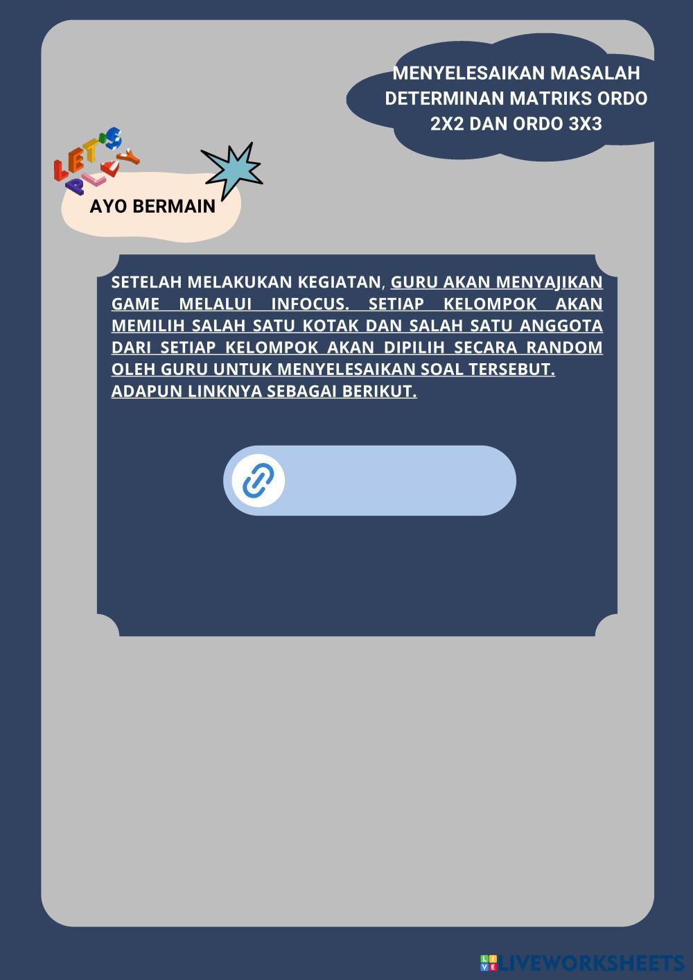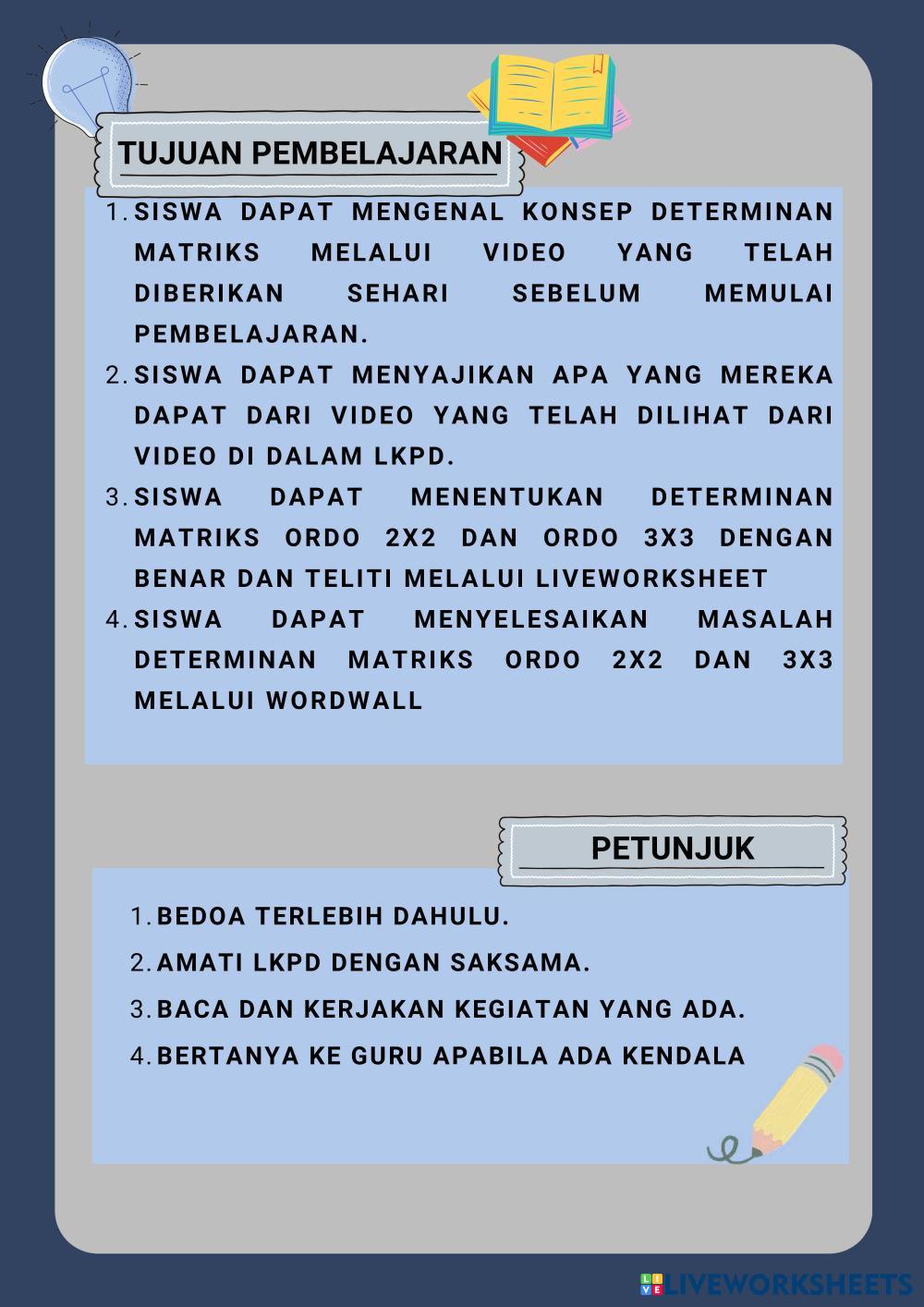 Created bytiara_aya_ Matematika Determinan matriks Age 15+ level: SMA Indonesian คำแนะนำของผู้เขียน My Google Classroom Courses × 0 classes selected (0 students total) Quick Access Select all classes (0 classes) All Classes Loading courses... ยกเลิก Share Share to selected Course __COURSE_NAME__ __STUDENT_NAME__ (__STUDENT_EMAIL__) determinan matriks ดาวน์โหลด Worksheet Validation Check my answers Emails my answers to my teacher ชื่อเต็ม Group/level School subject Teacher's email or key code Close ส่งข้อมูล Validating worksheet... (12) Your answers have been sent to your teacher. Good luck! OK We encountered an error submitting your answers. Please try again. OK โฆษณา | ใช้งานแบบไม่มีโฆษณา Created bytiara_aya_ Matematika Determinan matriks Age 15+ level: SMA Indonesian คำแนะนำของผู้เขียน