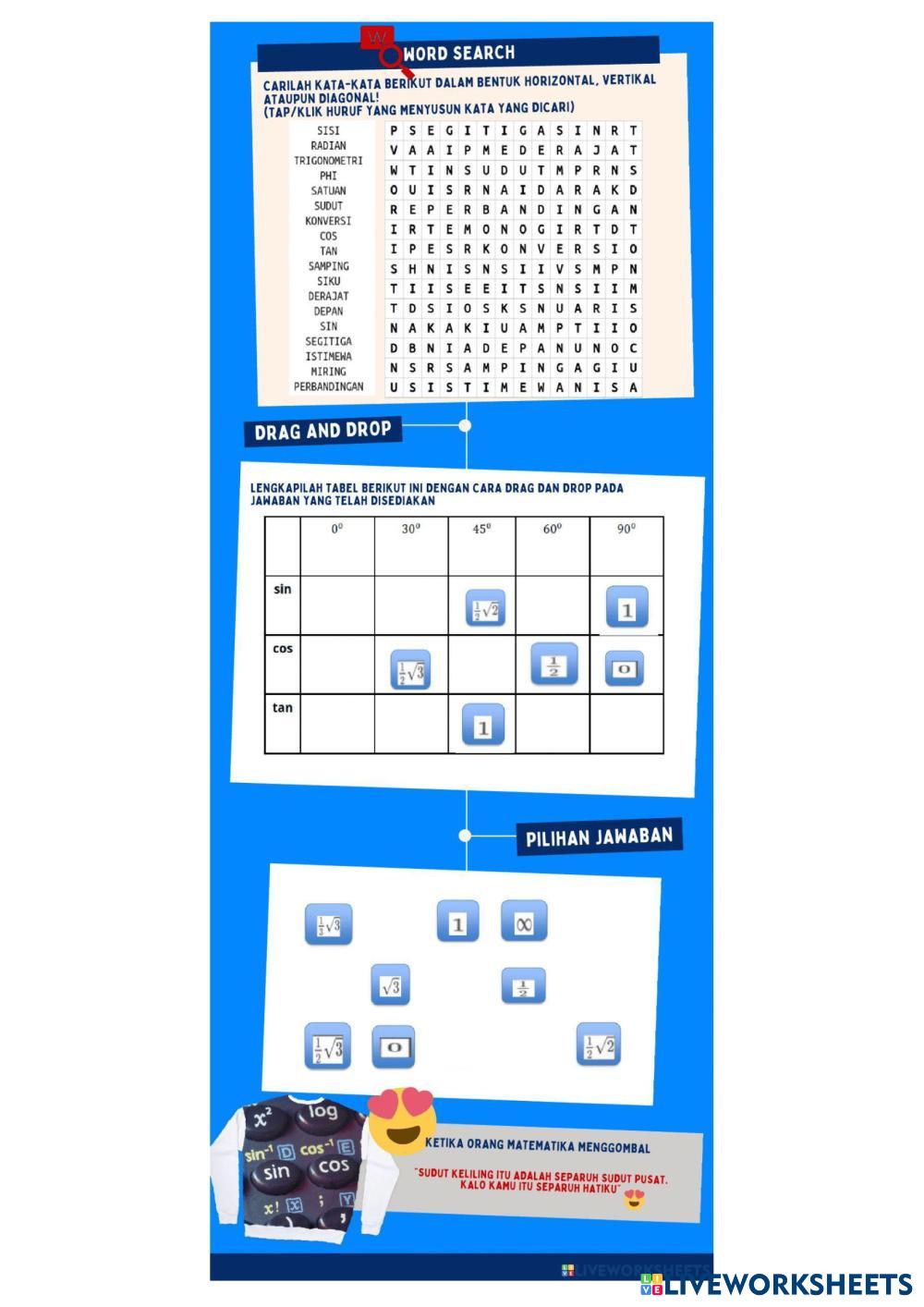 Created by yossiari คณิตศาสตร์ มัธยมศึกษาตอนปลาย ม.4 (มัธยมศึกษาปีที่ 4) ตรีโกณมิติ Indonesian คำแนะนำของผู้เขียน Kerjakan secara berkelompok My Google Classroom Courses × 0 classes selected (0 students total) Quick Access Select all classes (0 classes) All Classes Loading courses... ยกเลิก Share Share to selected Course __COURSE_NAME__ __STUDENT_NAME__ (__STUDENT_EMAIL__) Perbandingan Trigonometri 1 ดาวน์โหลด Worksheet Validation Check my answers Emails my answers to my teacher ชื่อเต็ม Group/level School subject Teacher's email or key code Close ส่งข้อมูล Validating worksheet... (12) Your answers have been sent to your teacher. Good luck! OK We encountered an error submitting your answers. Please try again. OK โฆษณา | ใช้งานแบบไม่มีโฆษณา Created by yossiari คณิตศาสตร์ มัธยมศึกษาตอนปลาย ม.4 (มัธยมศึกษาปีที่ 4) ตรีโกณมิติ Indonesian คำแนะนำของผู้เขียน Kerjakan secara berkelompok สำรวจแผ่นงาน 16-18 Math 10th grade 16-18 Trigonometry - Math Isilah dengan baik dan benar. Penerapan Trigonometri dalam Kehidupan Sehari-hari Math 10th grade Penerapan Trigonometri dalam Kehidupan Sehari-hari Trigonometry - Math Bacalah do’a terlebih dahulu Tuliskan Terlebih dahulu nama pada kolom yang disediakan pada LKPD Bacalah materi yang tertera pada LKPD dengan seksama Kerjakan soal sesuai tempat yang telah disediakan dan petunjuk yang telah diberikan dengan teliti, tekun, dan tepat waktu Setelah selesai mengerjakan LKPD, koreksi kembali hasil pekerjaan Anda kemudian klik finish untuk mengakhiri pekerjaan. RAZONES TRIGONOMÉTRICAS DE CUALQUIER ÁNGULO Math 10th grade RAZONES TRIGONOMÉTRICAS DE CUALQUIER ÁNGULO Trigonometry - Math Completa Sudut-sudut Istimewa dalam Trigonometri Math 10th grade Sudut-sudut Istimewa dalam Trigonometri Trigonometry - Math Bacalah do’a terlebih dahulu Tuliskan Terlebih dahulu nama pada kolom yang disediakan pada LKPD Bacalah materi yang tertera pada LKPD dengan seksama Kerjakan soal sesuai tempat yang telah disediakan dan petunjuk yang telah diberikan dengan teliti, tekun, dan tepat waktu Setelah selesai mengerjakan LKPD, koreksi kembali hasil pekerjaan Anda kemudian klik finish untuk mengakhiri pekerjaan.