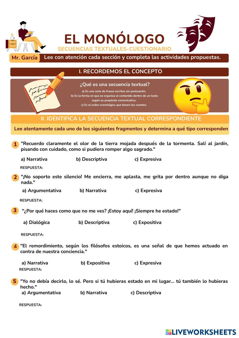 Created by jdnsg10 Lengua Castellana Lectura comprensiva Age 16+ level: 12th Spanish Author's Instructions My Google Classroom Courses × 0 classes selected (0 students total) Quick Access Select all classes (0 classes) All Classes Loading courses... ยกเลิก Share Share to selected Course __COURSE_NAME__ __STUDENT_NAME__ (__STUDENT_EMAIL__) Secuencias textuales - Practica orientada al monólogo ดาวน์โหลด Worksheet Validation Check my answers Emails my answers to my teacher ชื่อเต็ม Group/level School subject Teacher's email or key code Close ส่งข้อมูล Validating worksheet... (12) Your answers have been sent to your teacher. Good luck! OK We encountered an error submitting your answers. Please try again. OK โฆษณา | ใช้งานแบบไม่มีโฆษณา Created by jdnsg10 Lengua Castellana Lectura comprensiva Age 16+ level: 12th Spanish Author's Instructions