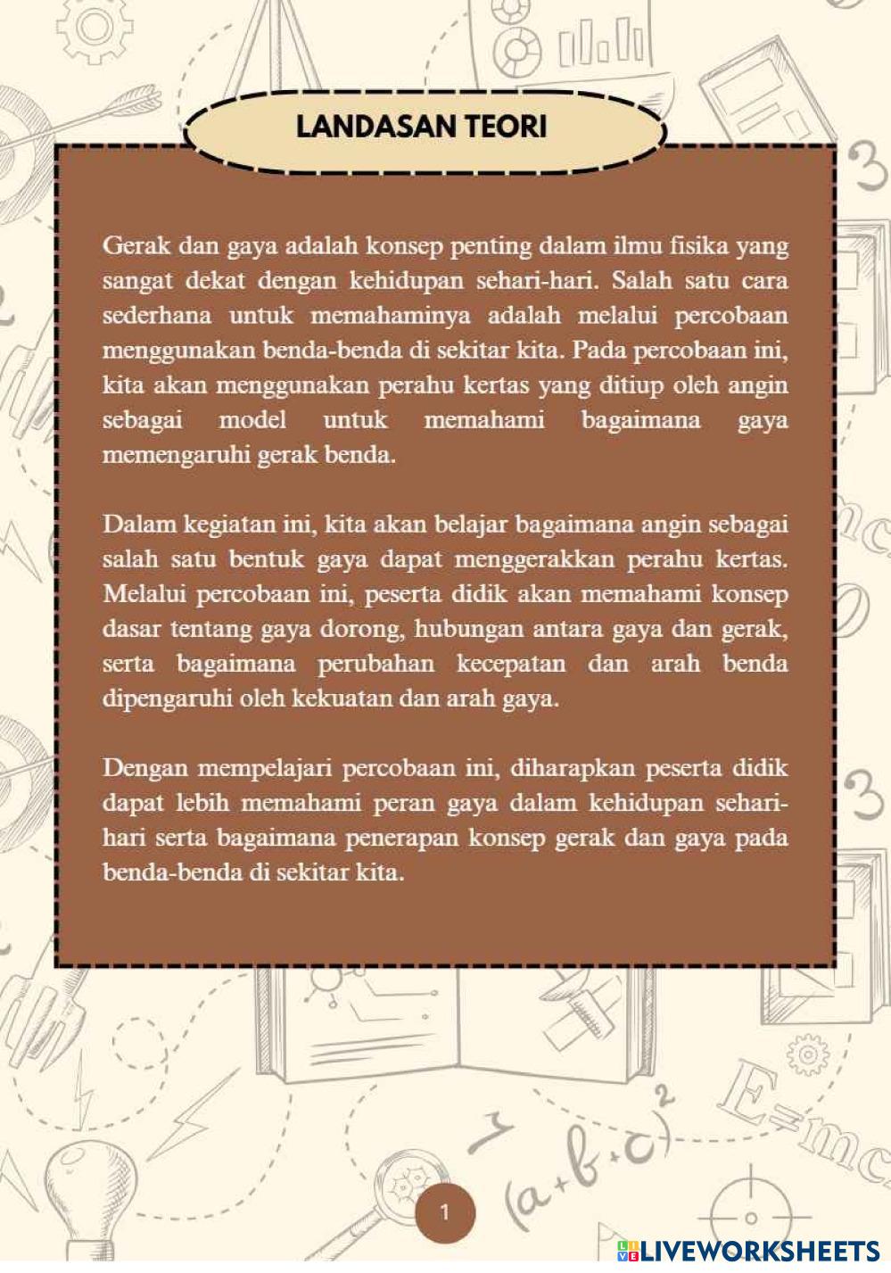Created bysismita Pendidikan IPA dan Bahasa Indonesia gerak dan gaya Age 12-16 level: 7 Indonesian คำแนะนำของผู้เขียน My Google Classroom Courses × 0 classes selected (0 students total) Quick Access Select all classes (0 classes) All Classes Loading courses... ยกเลิก Share Share to selected Course __COURSE_NAME__ __STUDENT_NAME__ (__STUDENT_EMAIL__) E-LKPD ดาวน์โหลด Worksheet Validation Check my answers Emails my answers to my teacher ชื่อเต็ม Group/level School subject Teacher's email or key code Close ส่งข้อมูล Validating worksheet... (12) Your answers have been sent to your teacher. Good luck! OK We encountered an error submitting your answers. Please try again. OK โฆษณา | ใช้งานแบบไม่มีโฆษณา Created bysismita Pendidikan IPA dan Bahasa Indonesia gerak dan gaya Age 12-16 level: 7 Indonesian คำแนะนำของผู้เขียน