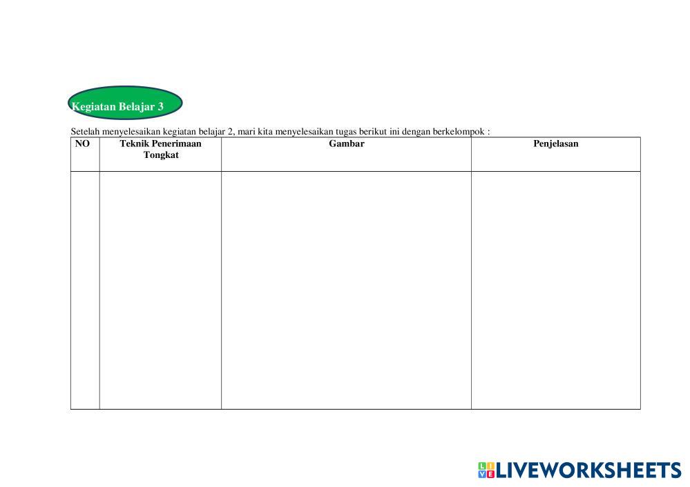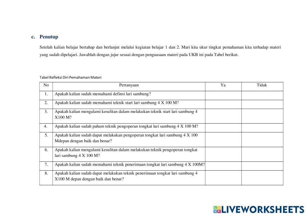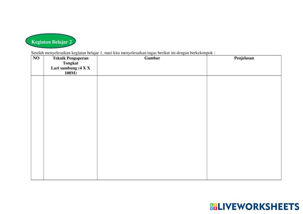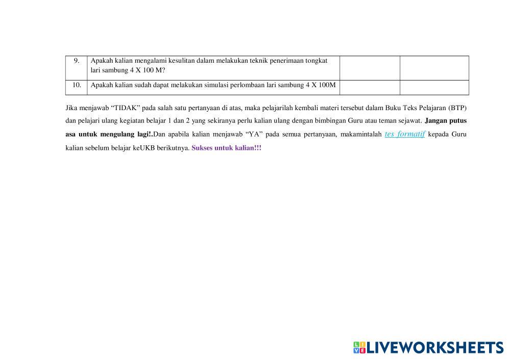 Created byAndriano Kristama Pendidikan Jasmani Olahraga dan Kesehata Pendidikan Jasmani Olahraga dan Kesehatan Age 17+ level: medium Indonesian คำแนะนำของผู้เขียน My Google Classroom Courses × 0 classes selected (0 students total) Quick Access Select all classes (0 classes) All Classes Loading courses... ยกเลิก Share Share to selected Course __COURSE_NAME__ __STUDENT_NAME__ (__STUDENT_EMAIL__) LKPD pembelajaran lari sambung kelas 11 fase F ดาวน์โหลด Worksheet Validation Check my answers Emails my answers to my teacher ชื่อเต็ม Group/level School subject Teacher's email or key code Close ส่งข้อมูล Validating worksheet... (12) Your answers have been sent to your teacher. Good luck! OK We encountered an error submitting your answers. Please try again. OK โฆษณา | ใช้งานแบบไม่มีโฆษณา Created byAndriano Kristama Pendidikan Jasmani Olahraga dan Kesehata Pendidikan Jasmani Olahraga dan Kesehatan Age 17+ level: medium Indonesian คำแนะนำของผู้เขียน
