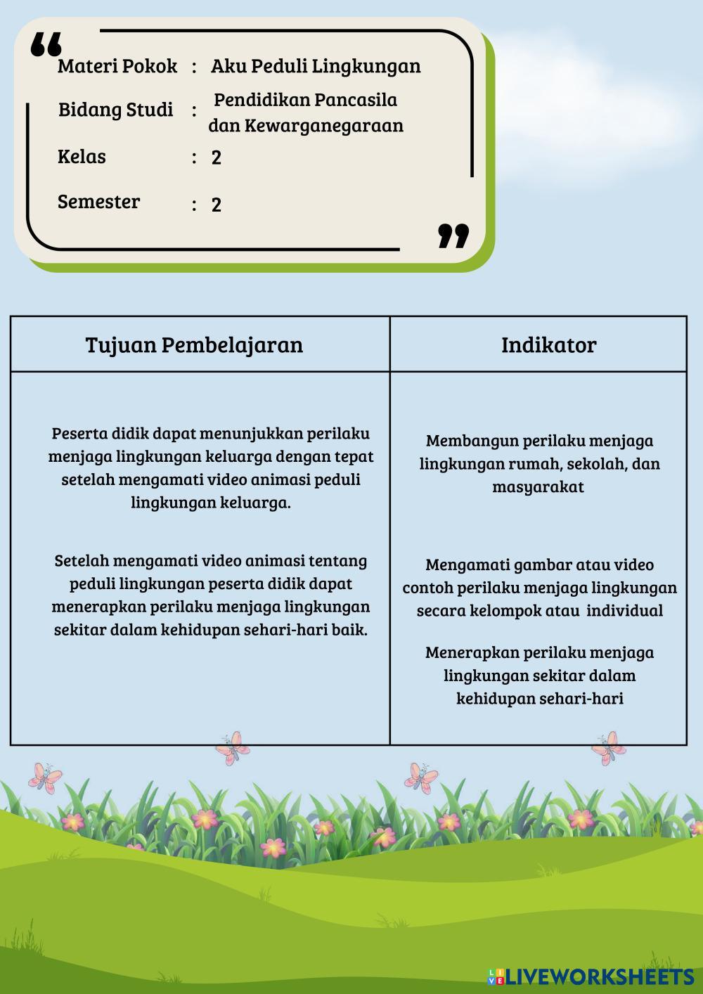 Created byDina Pramiswari Pendidikan Pancasila dan Kewarganegaraan (PPKn) Aku Peduli Lingkungan Age 7-14 level: 2 Indonesian คำแนะนำของผู้เขียน My Google Classroom Courses × 0 classes selected (0 students total) Quick Access Select all classes (0 classes) All Classes Loading courses... ยกเลิก Share Share to selected Course __COURSE_NAME__ __STUDENT_NAME__ (__STUDENT_EMAIL__) E-LKPD Pendidikan Pancasila ดาวน์โหลด Worksheet Validation Check my answers Emails my answers to my teacher ชื่อเต็ม Group/level School subject Teacher's email or key code Close ส่งข้อมูล Validating worksheet... (12) Your answers have been sent to your teacher. Good luck! OK We encountered an error submitting your answers. Please try again. OK โฆษณา | ใช้งานแบบไม่มีโฆษณา Created byDina Pramiswari Pendidikan Pancasila dan Kewarganegaraan (PPKn) Aku Peduli Lingkungan Age 7-14 level: 2 Indonesian คำแนะนำของผู้เขียน