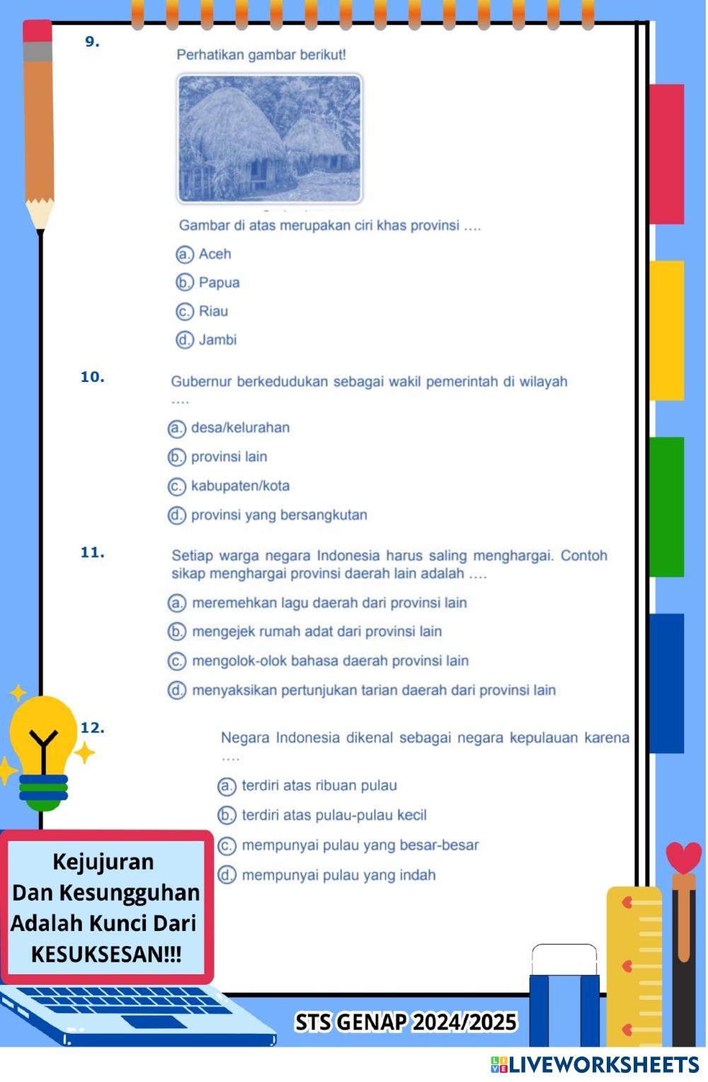 Created byM. Asrofi Pendidikan Pancasila SD latihan pendidikan pancasila Age 10-17 level: 6 Indonesian Author's Instructions My Google Classroom Courses × 0 classes selected (0 students total) Quick Access Select all classes (0 classes) All Classes Loading courses... ยกเลิก Share Share to selected Course __COURSE_NAME__ __STUDENT_NAME__ (__STUDENT_EMAIL__) SUMATIF TENGAH SEMESTER 2 ดาวน์โหลด Worksheet Validation Check my answers Emails my answers to my teacher ชื่อเต็ม Group/level School subject Teacher's email or key code Close ส่งข้อมูล Validating worksheet... (12) Your answers have been sent to your teacher. Good luck! OK We encountered an error submitting your answers. Please try again. OK โฆษณา | ใช้งานแบบไม่มีโฆษณา Created byM. Asrofi Pendidikan Pancasila SD latihan pendidikan pancasila Age 10-17 level: 6 Indonesian Author's Instructions