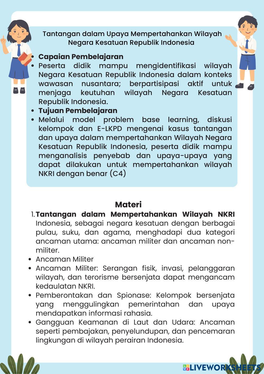 Created byAsri Pendidikan Pancasila Menjaga Keutuhan wilayah NKRI Age 13+ level: SMP Indonesian Author's Instructions My Google Classroom Courses × 0 classes selected (0 students total) Quick Access Select all classes (0 classes) All Classes Loading courses... ยกเลิก Share Share to selected Course __COURSE_NAME__ __STUDENT_NAME__ (__STUDENT_EMAIL__) Tantangan dalam Upaya Mempertahankan Wilayah Negara Kesatuan Republik Indonesia ดาวน์โหลด Worksheet Validation Check my answers Emails my answers to my teacher ชื่อเต็ม Group/level School subject Teacher's email or key code Close ส่งข้อมูล Validating worksheet... (12) Your answers have been sent to your teacher. Good luck! OK We encountered an error submitting your answers. Please try again. OK โฆษณา | ใช้งานแบบไม่มีโฆษณา Created byAsri Pendidikan Pancasila Menjaga Keutuhan wilayah NKRI Age 13+ level: SMP Indonesian Author's Instructions