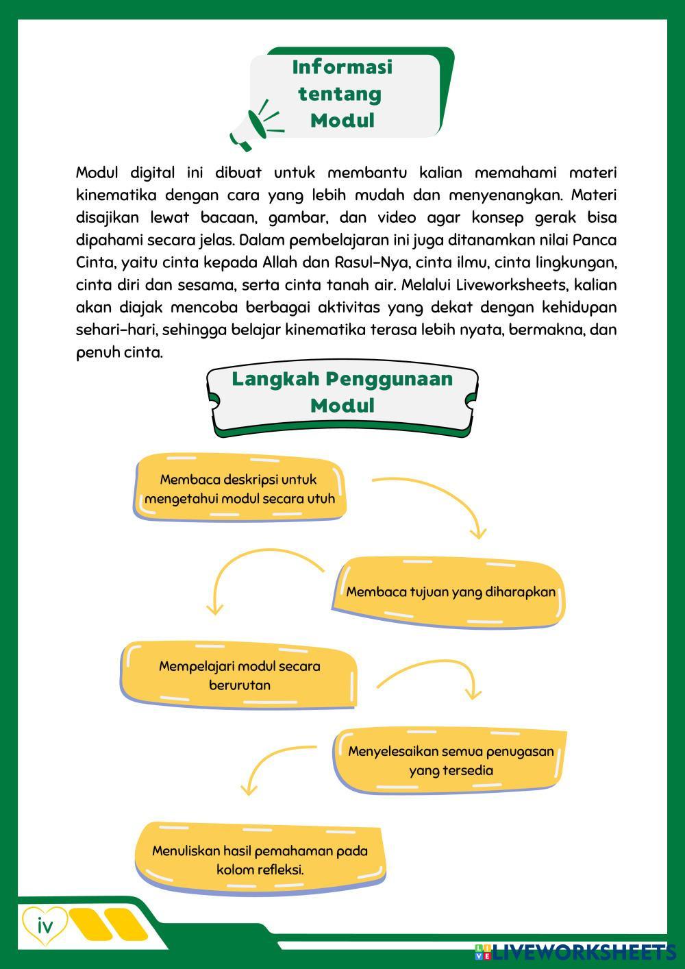 Modul digital ini dibuat untuk membantu kalian memahami materi kinematika dengan cara yang lebih mudah dan menyenangkan. Materi disajikan lewat bacaan, gambar, dan video agar konsep gerak bisa dipahami secara jelas. Dalam pembelajaran ini juga ditanamkan nilai Panca Cinta, yaitu cinta kepada Allah dan Rasul-Nya, cinta ilmu, cinta lingkungan, cinta diri dan sesama, serta cinta tanah air. Melalui Liveworksheets, kalian akan diajak mencoba berbagai aktivitas yang dekat dengan kehidupan sehari-hari, sehingga belajar kinematika terasa lebih nyata, bermakna, dan penuh cinta.