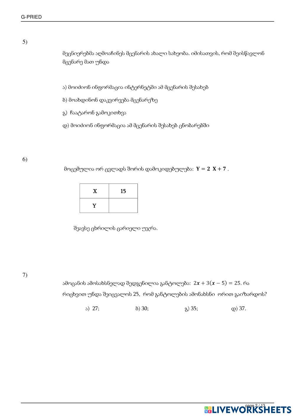 Created byKutaisi33 Math მე-2 სემესტრის დიაგნოსტიკა Age 11-16 level: 6 Georgian Author's Instructions My Google Classroom Courses × 0 classes selected (0 students total) Quick Access Select all classes (0 classes) All Classes Loading courses... ยกเลิก Share Share to selected Course __COURSE_NAME__ __STUDENT_NAME__ (__STUDENT_EMAIL__) 6 კლ მათემატიკის დიაგნოსტიკა ดาวน์โหลด Worksheet Validation Check my answers Emails my answers to my teacher ชื่อเต็ม Group/level School subject Teacher's email or key code Close ส่งข้อมูล Validating worksheet... (12) Your answers have been sent to your teacher. Good luck! OK We encountered an error submitting your answers. Please try again. OK โฆษณา | ใช้งานแบบไม่มีโฆษณา Created byKutaisi33 Math მე-2 სემესტრის დიაგნოსტიკა Age 11-16 level: 6 Georgian Author's Instructions
