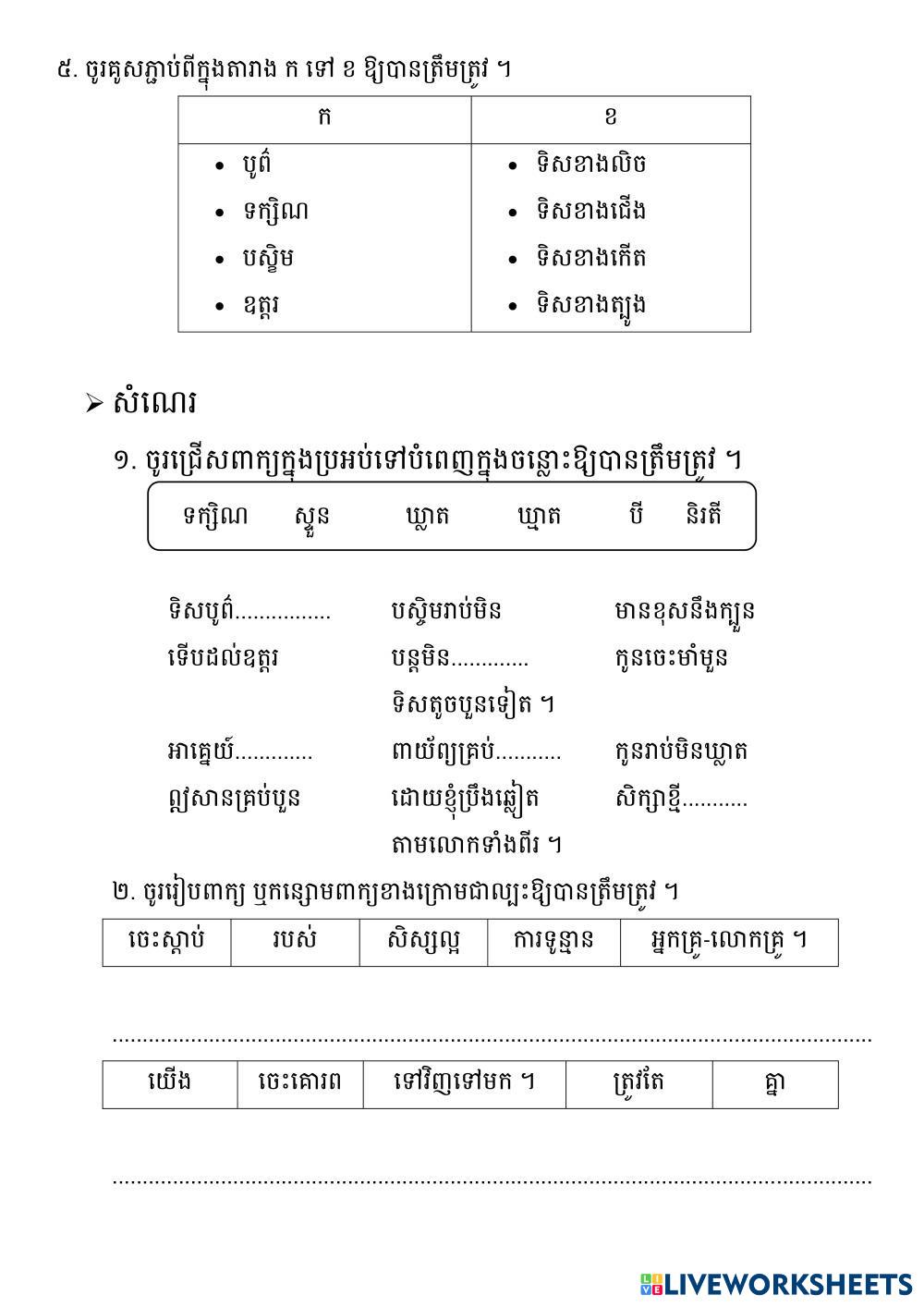 Created byLinda_Keo លំហាត់ភាសាខ្មែរ កិច្ចការក្នុងថ្នាក់ Age 8-13 level: ថ្នាក់ទី៣ Khmer Author's Instructions My Google Classroom Courses × 0 classes selected (0 students total) Quick Access Select all classes (0 classes) All Classes Loading courses... ยกเลิก Share Share to selected Course __COURSE_NAME__ __STUDENT_NAME__ (__STUDENT_EMAIL__) លំហាត់បញ្ចប់មេរៀនទី២០ ดาวน์โหลด Worksheet Validation Check my answers Emails my answers to my teacher ชื่อเต็ม Group/level School subject Teacher's email or key code Close ส่งข้อมูล Validating worksheet... (12) Your answers have been sent to your teacher. Good luck! OK We encountered an error submitting your answers. Please try again. OK โฆษณา | ใช้งานแบบไม่มีโฆษณา Created byLinda_Keo លំហាត់ភាសាខ្មែរ កិច្ចការក្នុងថ្នាក់ Age 8-13 level: ថ្នាក់ទី៣ Khmer Author's Instructions