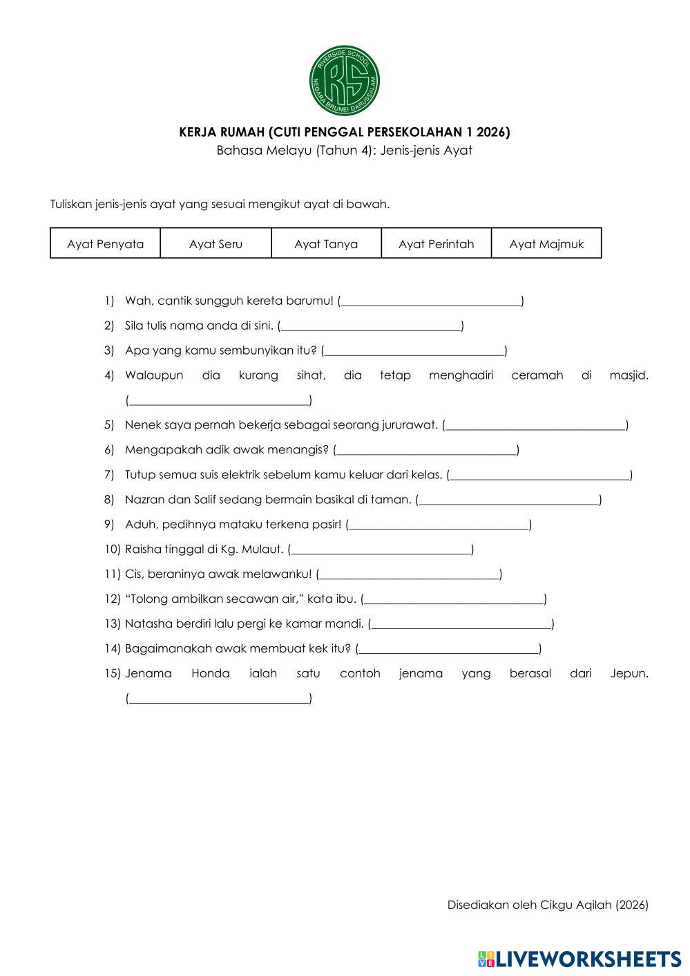 Created byAqilah Othman ESL Malay A1 (เริ่มต้น) การเขียน Malay คำแนะนำของผู้เขียน Sila jawab soalan yang telah disediakan. My Google Classroom Courses × 0 classes selected (0 students total) Quick Access Select all classes (0 classes) All Classes Loading courses... ยกเลิก Share Share to selected Course __COURSE_NAME__ __STUDENT_NAME__ (__STUDENT_EMAIL__) BM Tahun 4 (Jenis-Jenis Ayat) ดาวน์โหลด Worksheet Validation Check my answers Emails my answers to my teacher ชื่อเต็ม Group/level School subject Teacher's email or key code Close ส่งข้อมูล Validating worksheet... (12) Your answers have been sent to your teacher. Good luck! OK We encountered an error submitting your answers. Please try again. OK โฆษณา | ใช้งานแบบไม่มีโฆษณา Created byAqilah Othman ESL Malay A1 (เริ่มต้น) การเขียน Malay คำแนะนำของผู้เขียน Sila jawab soalan yang telah disediakan. สำรวจแผ่นงาน BM Tahun 5 (Jenis-Jenis Ayat) ESL A1 BM Tahun 5 (Jenis-Jenis Ayat) Writing - ESL Sila jawab soalan yang disediakan. MIB Tahun 6 (Makna Perkataan) ESL A1 MIB Tahun 6 (Makna Perkataan) Writing - ESL Sila jawab soalan yang diberikan. BM Tahun 6 (TB dan KH) ESL A1 BM Tahun 6 (TB dan KH) Writing - ESL Sila jawab soalan yang diberikan. PEKERJAAN BIK TAHUN 1 ESL A1 PEKERJAAN BIK TAHUN 1 Writing - ESL PADANKAN GAMBAR DENGAN ISYARAT YANG BETUL.
