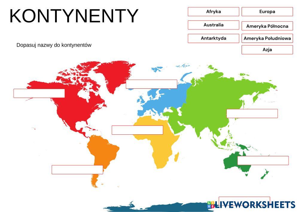 Dopasuj nazwę kontynentu do kontynentu na mapie.