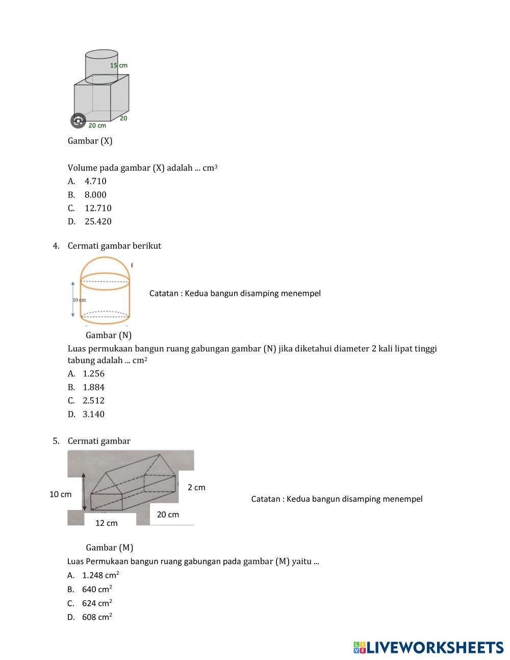 Created bywida MATEMATIKA bangun ruang gabungan Age 11-15 level: ENAM Indonesian Author's Instructions Matematika bangun Ruang Gabungan My Google Classroom Courses × 0 classes selected (0 students total) Quick Access Select all classes (0 classes) All Classes Loading courses... ยกเลิก Share Share to selected Course __COURSE_NAME__ __STUDENT_NAME__ (__STUDENT_EMAIL__) Matematika bangun Ruang Gabungan ดาวน์โหลด Worksheet Validation Check my answers Emails my answers to my teacher ชื่อเต็ม Group/level School subject Teacher's email or key code Close ส่งข้อมูล Validating worksheet... (12) Your answers have been sent to your teacher. Good luck! OK We encountered an error submitting your answers. Please try again. OK โฆษณา | ใช้งานแบบไม่มีโฆษณา Created bywida MATEMATIKA bangun ruang gabungan Age 11-15 level: ENAM Indonesian Author's Instructions Matematika bangun Ruang Gabungan