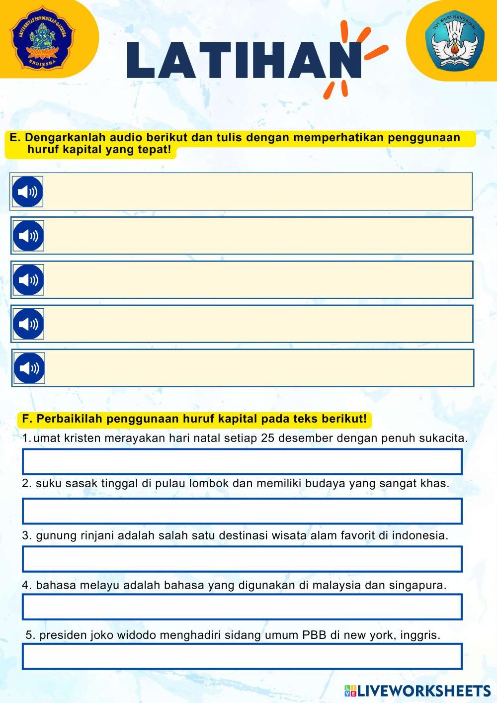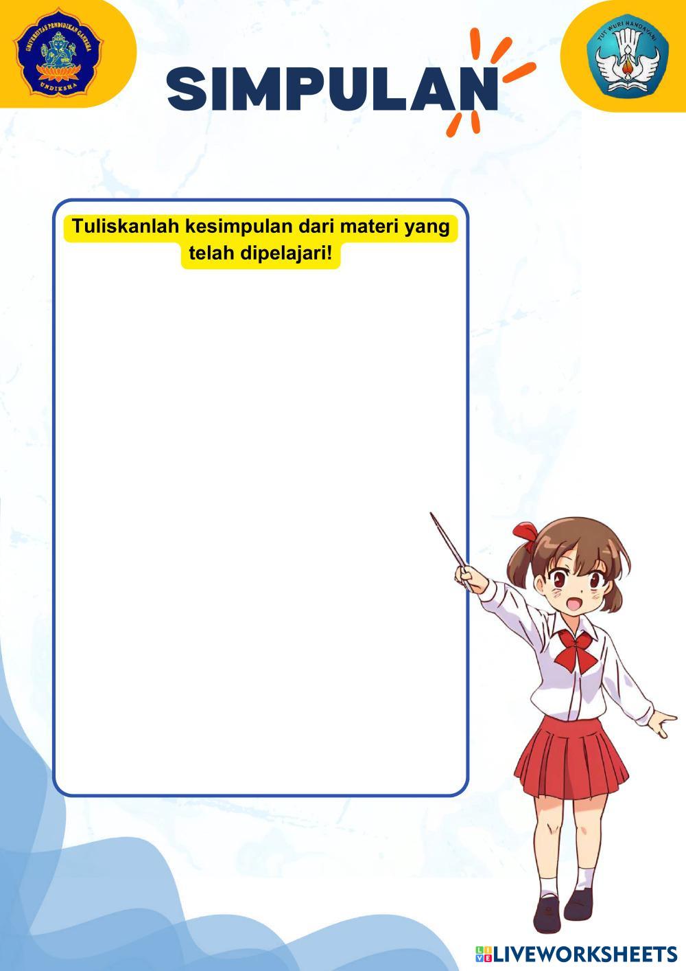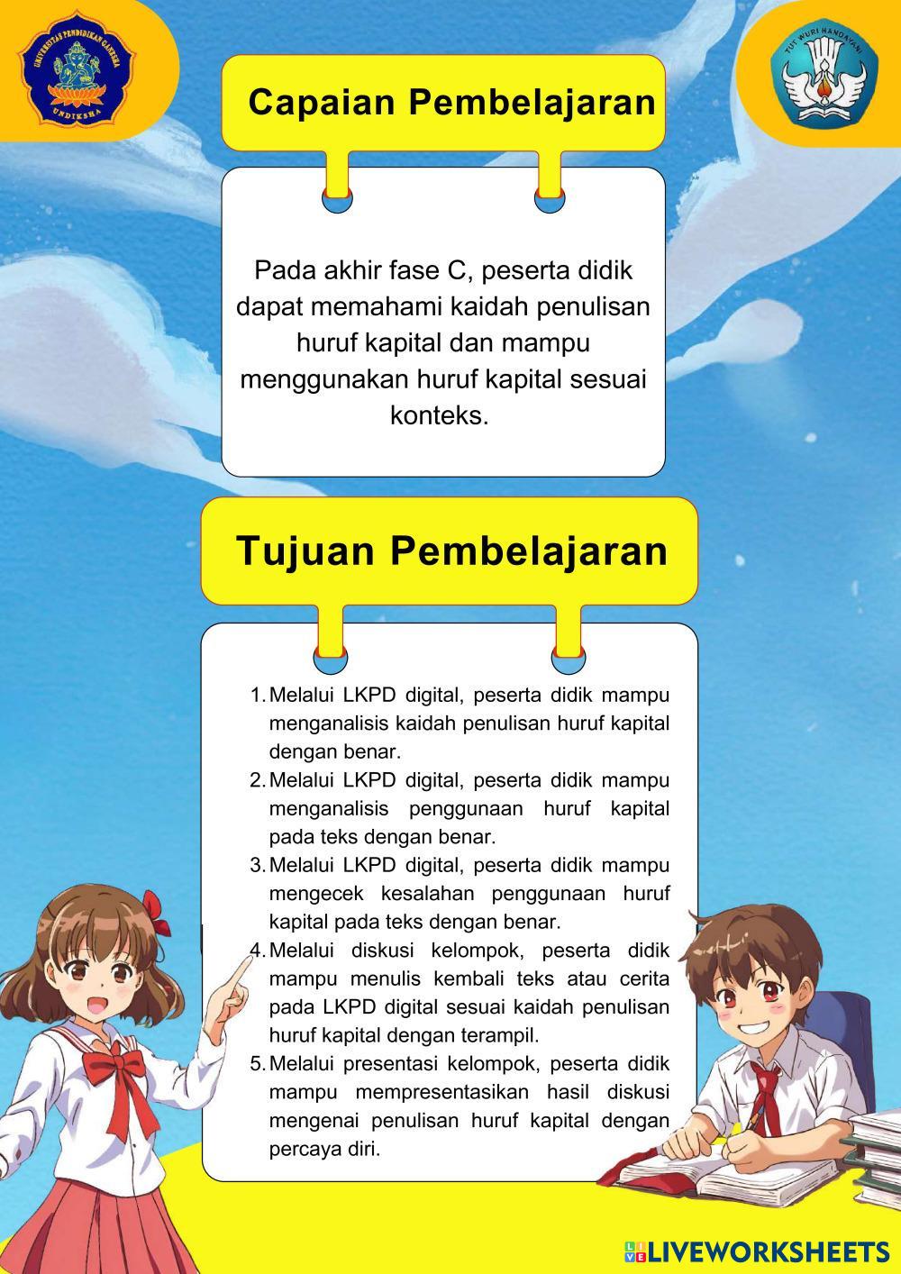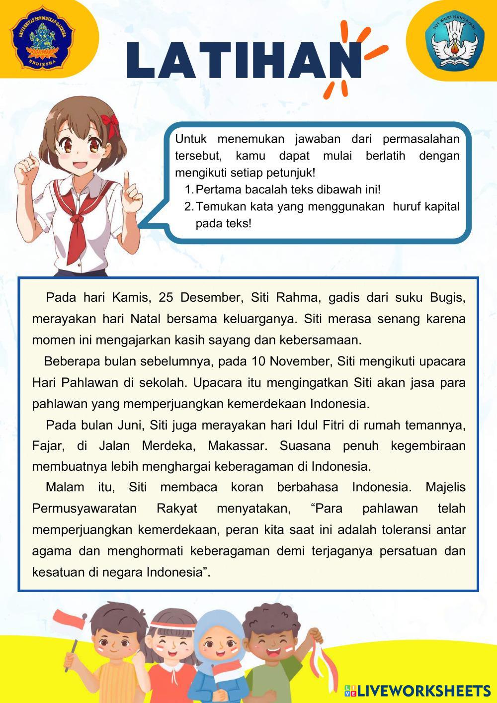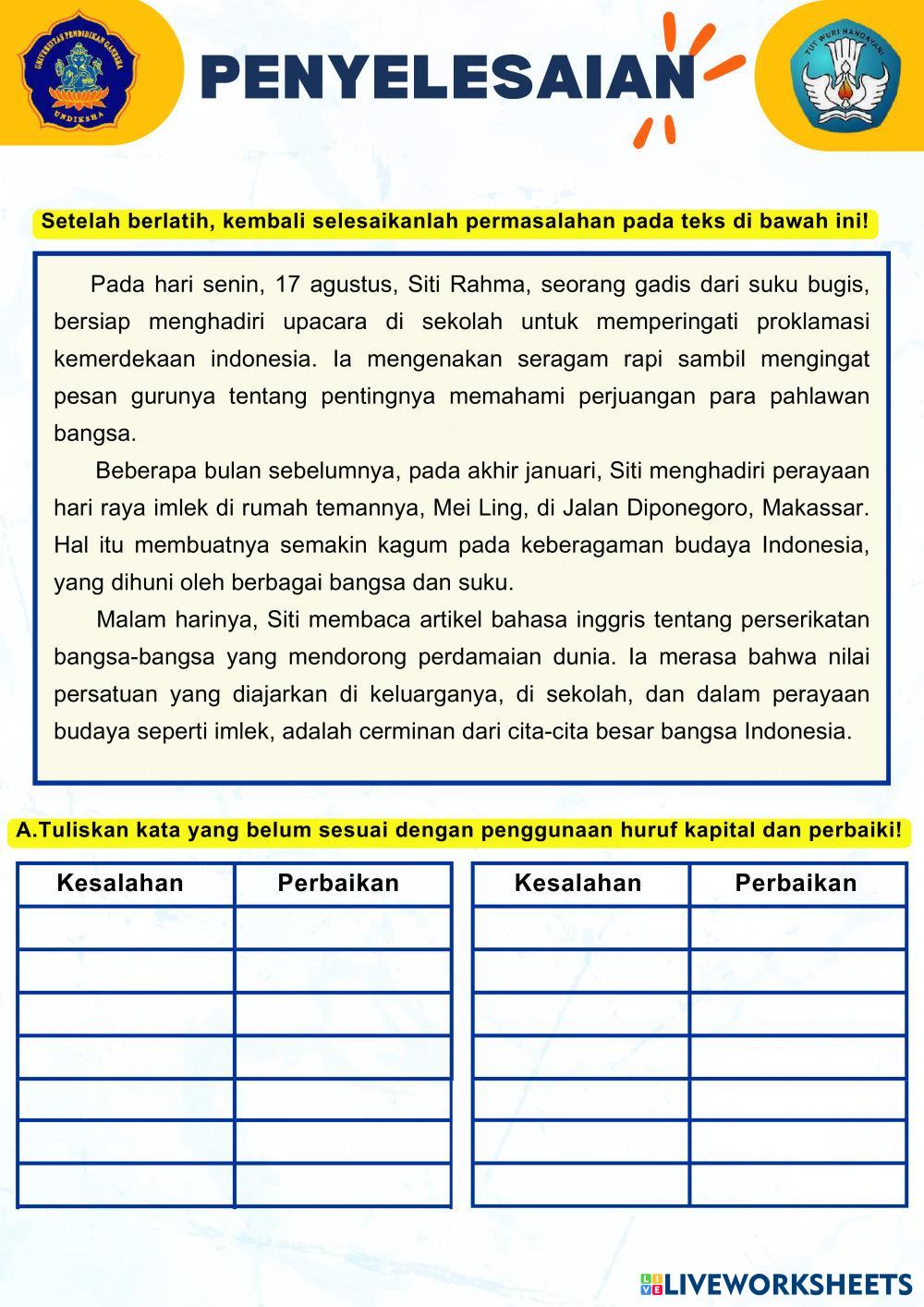 Created byDINA Bahasa Indonesia Bahasa Indonesia Age 10-15 level: 5 Indonesian Author's Instructions My Google Classroom Courses × 0 classes selected (0 students total) Quick Access Select all classes (0 classes) All Classes Loading courses... ยกเลิก Share Share to selected Course __COURSE_NAME__ __STUDENT_NAME__ (__STUDENT_EMAIL__) LKPD Digital Penggunaan Huruf Kapital untuk Kelas 5 SD_2 ดาวน์โหลด Worksheet Validation Check my answers Emails my answers to my teacher ชื่อเต็ม Group/level School subject Teacher's email or key code Close ส่งข้อมูล Validating worksheet... (12) Your answers have been sent to your teacher. Good luck! OK We encountered an error submitting your answers. Please try again. OK โฆษณา | ใช้งานแบบไม่มีโฆษณา Created byDINA Bahasa Indonesia Bahasa Indonesia Age 10-15 level: 5 Indonesian Author's Instructions