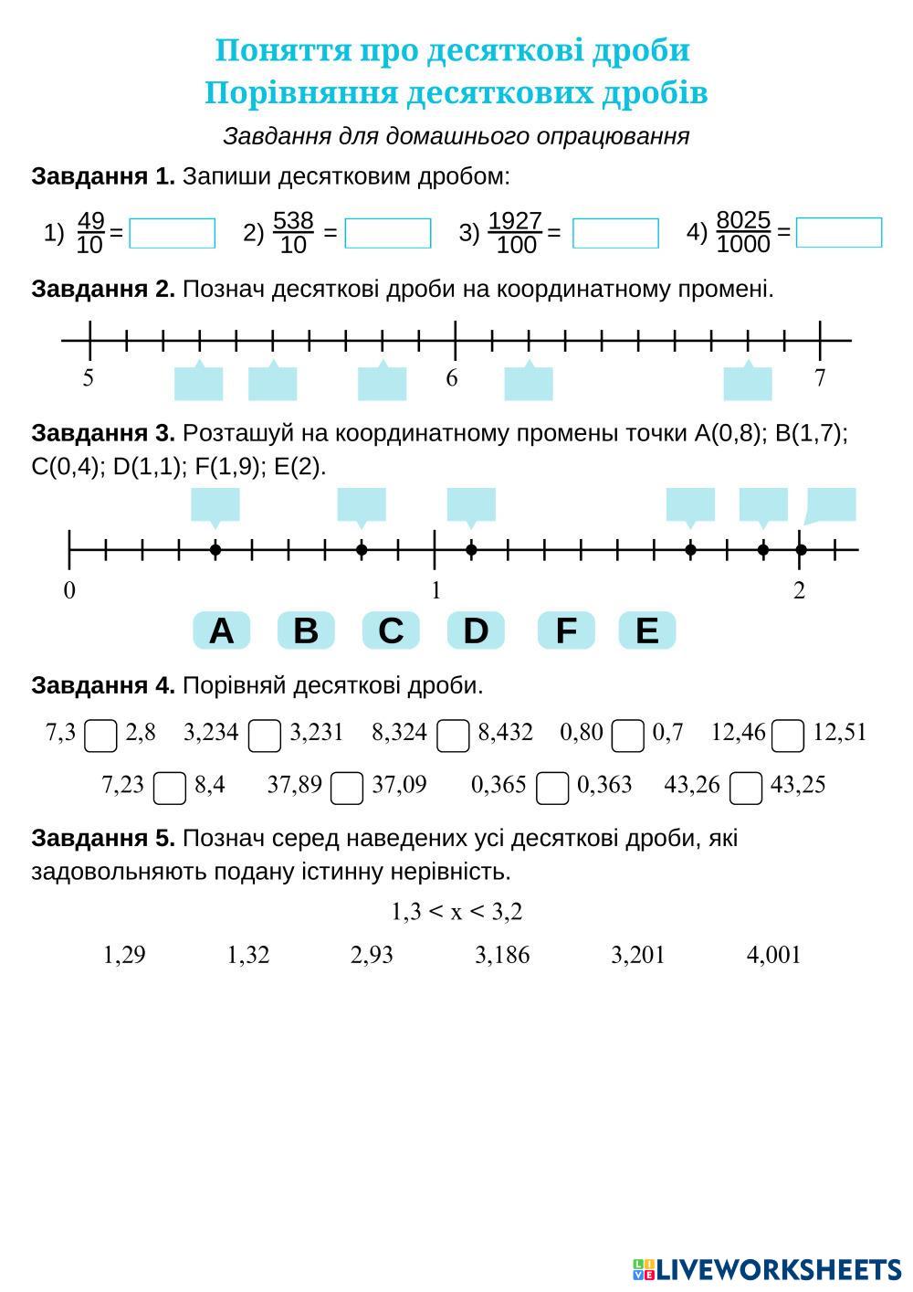 Пригадайте як перетворити звичайний дріб на десятковий, як позначити дріб на координатному промені.Виконайте порівняння дробів.