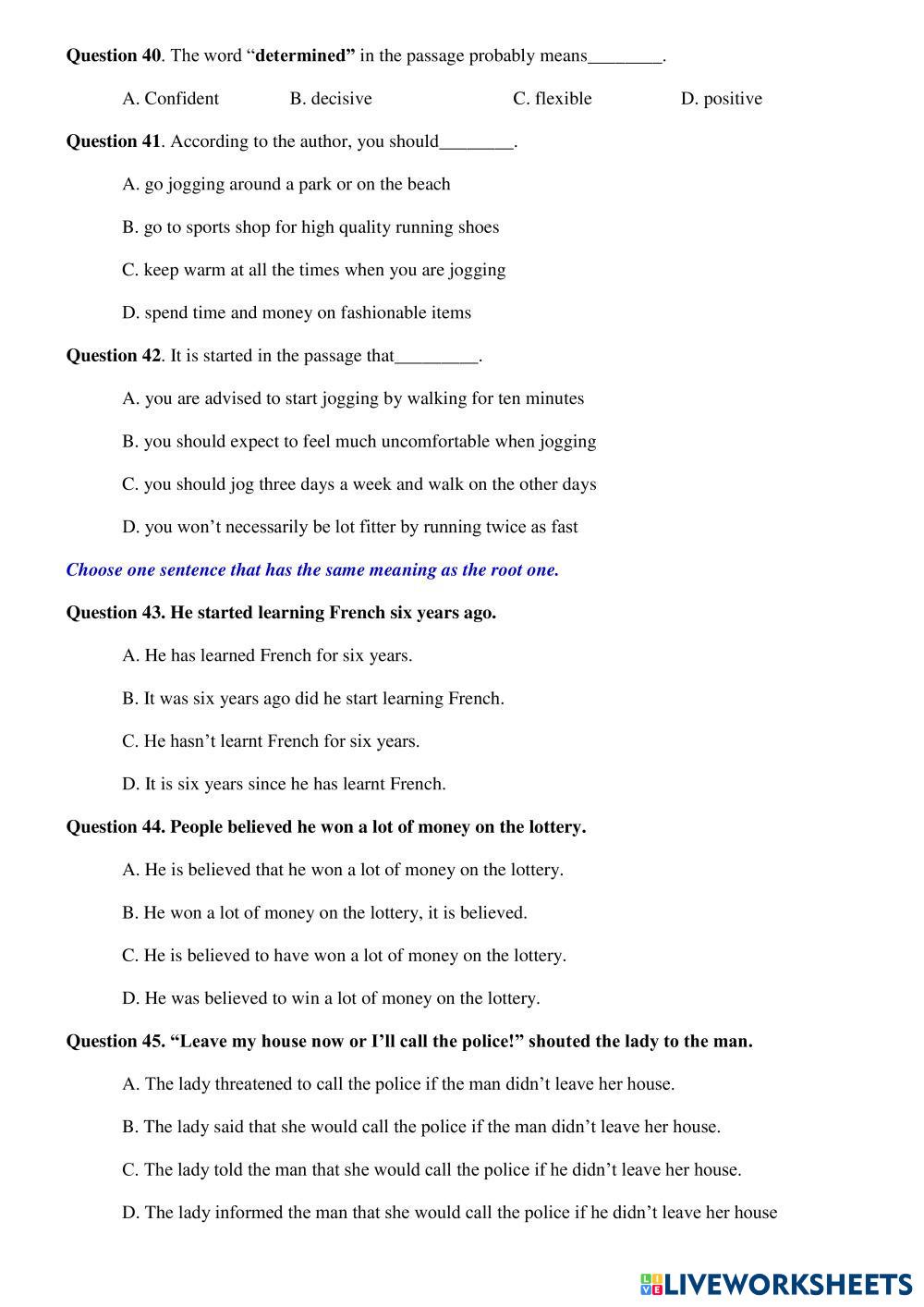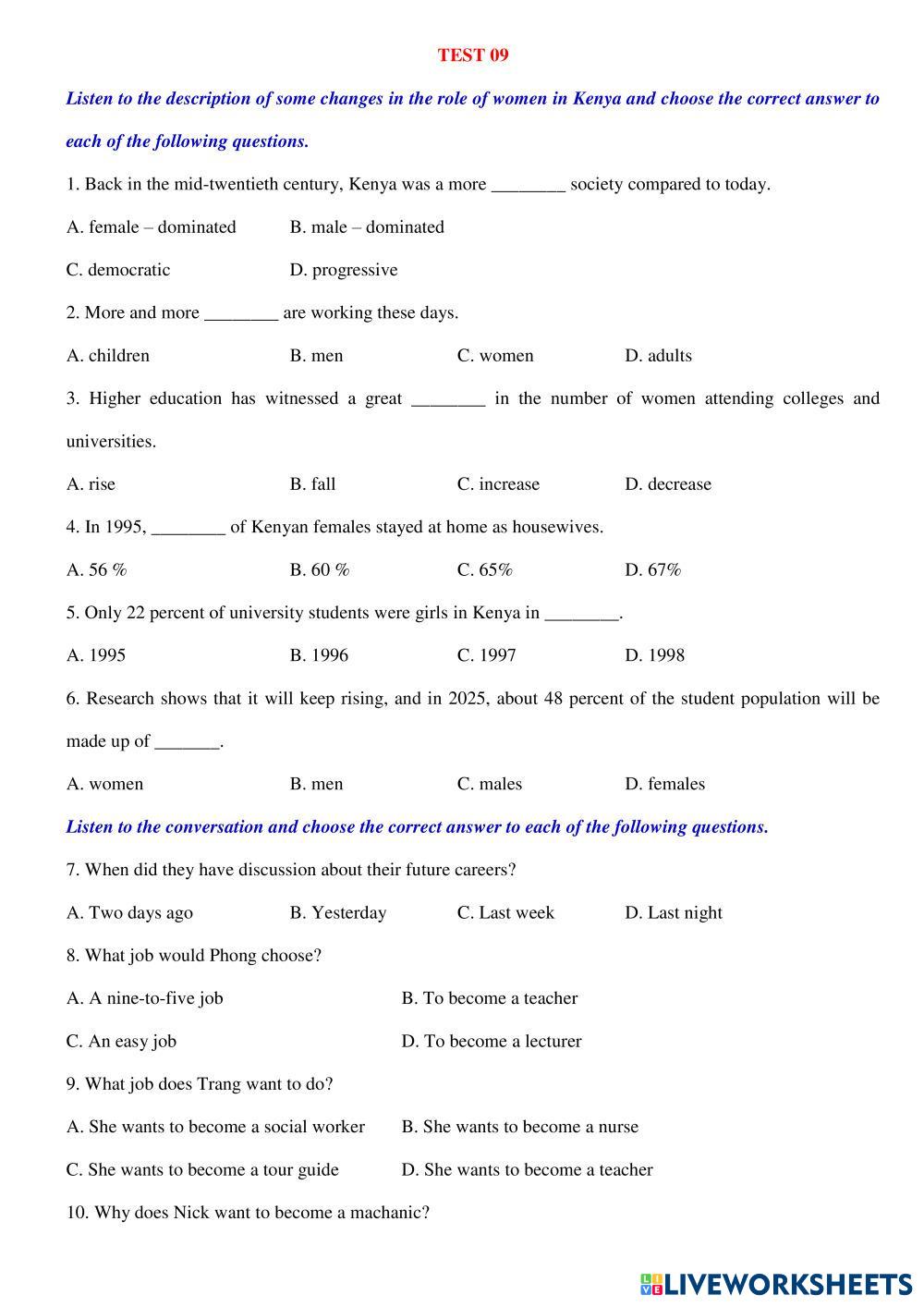 Created by Msngoc English as a Second Language (ESL) Test Age 12-18 level: 9 Vietnamese Author's Instructions My Google Classroom Courses × 0 classes selected (0 students total) Quick Access Select all classes (0 classes) All Classes Loading courses... ยกเลิก Share Share to selected Course __COURSE_NAME__ __STUDENT_NAME__ (__STUDENT_EMAIL__) ĐỀ THI VÀO 10 - TEST 09 ดาวน์โหลด Worksheet Validation Check my answers Emails my answers to my teacher ชื่อเต็ม Group/level School subject Teacher's email or key code Close ส่งข้อมูล Validating worksheet... (12) Your answers have been sent to your teacher. Good luck! OK We encountered an error submitting your answers. Please try again. OK โฆษณา | ใช้งานแบบไม่มีโฆษณา Created by Msngoc English as a Second Language (ESL) Test Age 12-18 level: 9 Vietnamese Author's Instructions