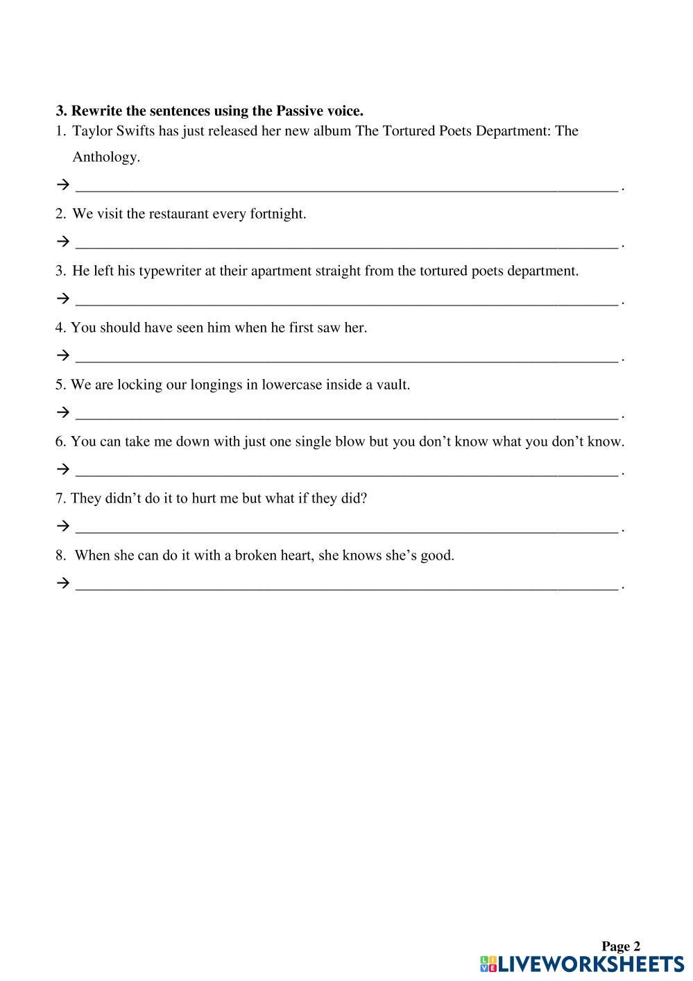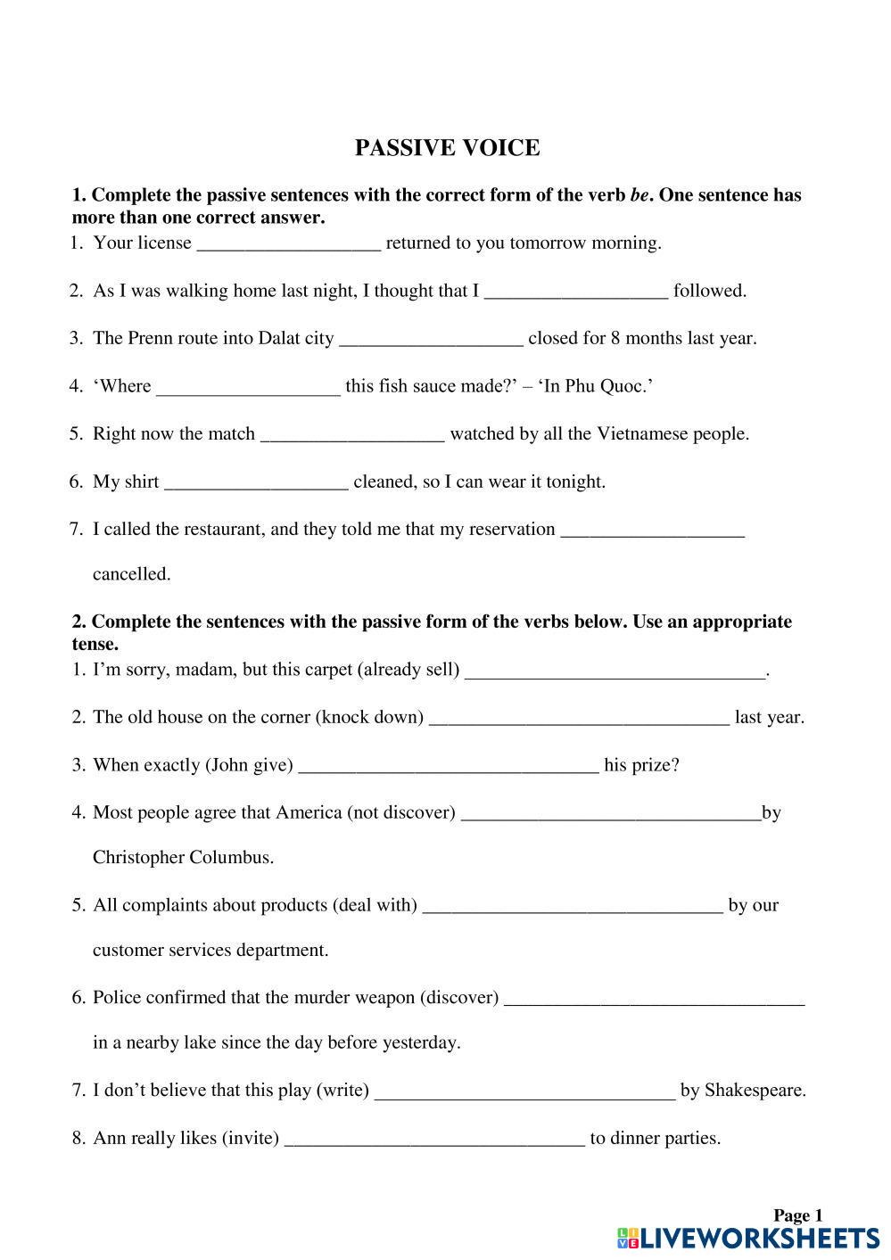 Created byANH DOAN English as a Second Language (ESL) PASSIVE VOICE Age 15+ level: 11 Vietnamese Author's Instructions My Google Classroom Courses × 0 classes selected (0 students total) Quick Access Select all classes (0 classes) All Classes Loading courses... ยกเลิก Share Share to selected Course __COURSE_NAME__ __STUDENT_NAME__ (__STUDENT_EMAIL__) Passive voice - Study guide - Grade 11 - Friends Global 11 ดาวน์โหลด Worksheet Validation Check my answers Emails my answers to my teacher ชื่อเต็ม Group/level School subject Teacher's email or key code Close ส่งข้อมูล Validating worksheet... (12) Your answers have been sent to your teacher. Good luck! OK We encountered an error submitting your answers. Please try again. OK โฆษณา | ใช้งานแบบไม่มีโฆษณา Created byANH DOAN English as a Second Language (ESL) PASSIVE VOICE Age 15+ level: 11 Vietnamese Author's Instructions