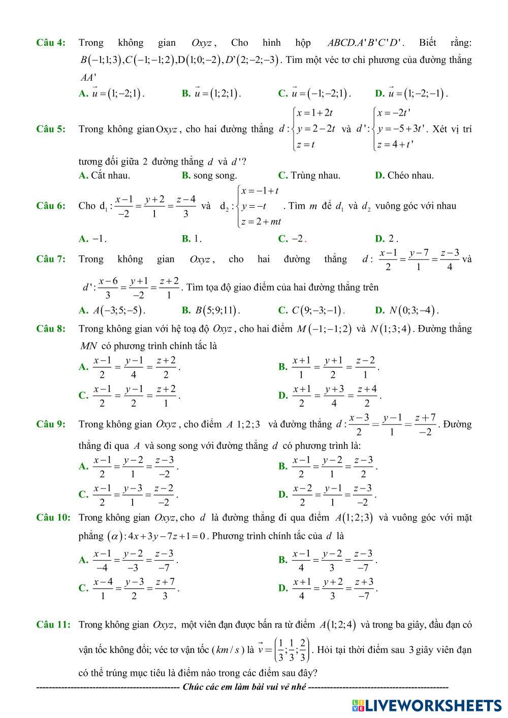 Created byLê Thị Hồng Vân คณิตศาสตร์ มัธยมศึกษาตอนปลาย ม.6 (มัธยมศึกษาปีที่ 6) พีชคณิต Vietnamese คำแนะนำของผู้เขียน Các em làm đề luyện tập nhé My Google Classroom Courses × 0 classes selected (0 students total) Quick Access Select all classes (0 classes) All Classes Loading courses... ยกเลิก Share Share to selected Course __COURSE_NAME__ __STUDENT_NAME__ (__STUDENT_EMAIL__) PHƯƠNG TRÌNH ĐƯỜNG THẲNG 1 ดาวน์โหลด Worksheet Validation Check my answers Emails my answers to my teacher ชื่อเต็ม Group/level School subject Teacher's email or key code Close ส่งข้อมูล Validating worksheet... (12) Your answers have been sent to your teacher. Good luck! OK We encountered an error submitting your answers. Please try again. OK โฆษณา | ใช้งานแบบไม่มีโฆษณา Created byLê Thị Hồng Vân คณิตศาสตร์ มัธยมศึกษาตอนปลาย ม.6 (มัธยมศึกษาปีที่ 6) พีชคณิต Vietnamese คำแนะนำของผู้เขียน Các em làm đề luyện tập nhé สำรวจแผ่นงาน GTLN và GTNN 2 Math 12th grade GTLN và GTNN 2 Algebra - Math Các em làm đề luyện tập nhé GTLN và GTNN 1 Math 12th grade GTLN và GTNN 1 Algebra - Math Các em làm đề luyện tập nhé ĐƠN ĐIỆU VÀ CỰC TRỊ 1 Math 12th grade ĐƠN ĐIỆU VÀ CỰC TRỊ 1 Algebra - Math Các em làm đề luyện tập nhé ĐƠN ĐIỆU VÀ CỰC TRỊ 2 Math 12th grade ĐƠN ĐIỆU VÀ CỰC TRỊ 2 Algebra - Math Các em làm đề luyện tập nhé