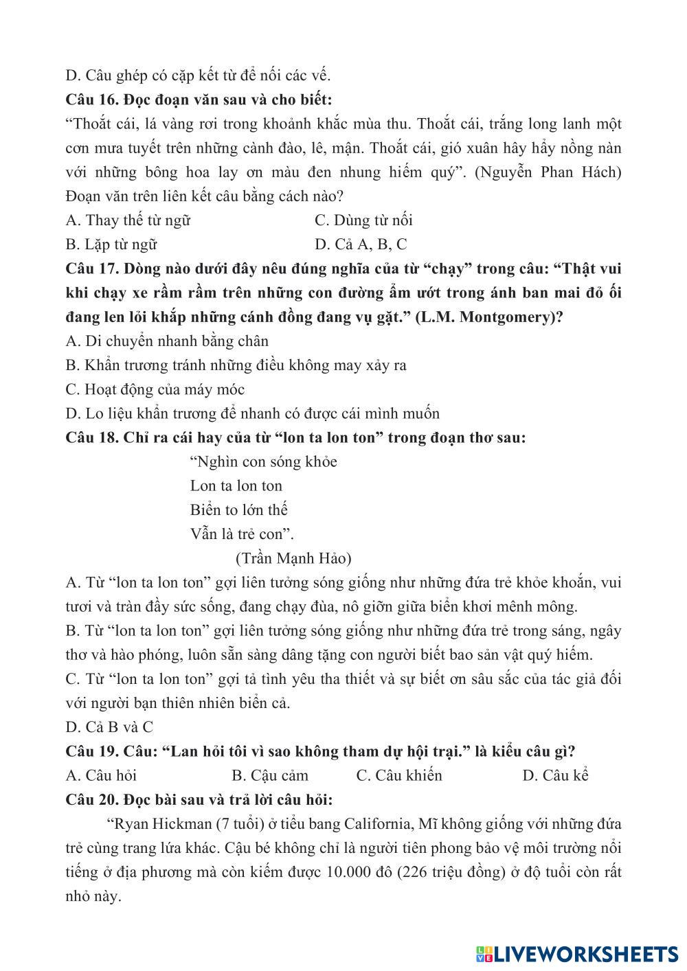 Đề luyện online số 2 (lớp thứ 7)