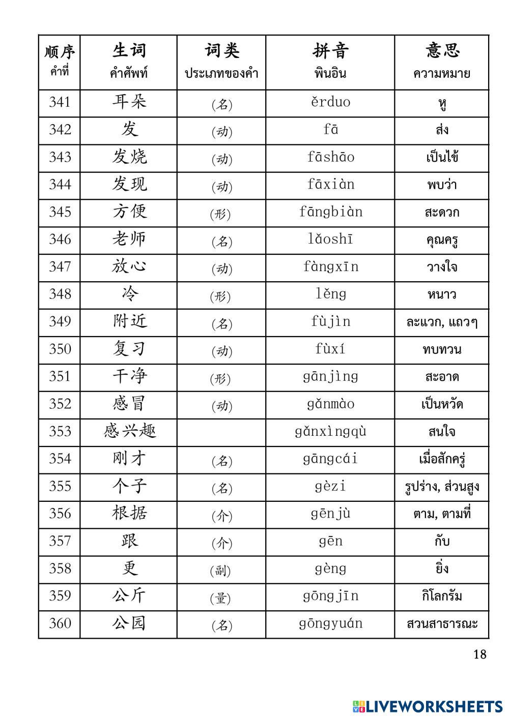 คำศัพท์ภาษาจีน ป.2 เทอม 2 คำที่ 361-400
