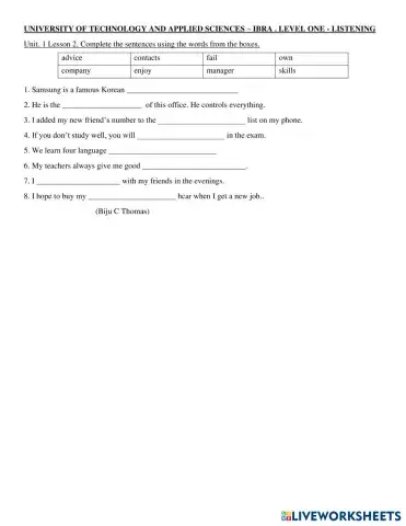 U1 Listening B voc 1 - 5 words