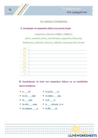 • ΓΡΑΜΜΑΤΙΚΗ ΤΑ ΒΗΜΑΤΑ ΜΟΥ ΣΤΗ ΓΡΑΜΜΑΤΙΚΗ - Β' ΔΗΜΟΤΙΚΟΥ - Α΄ ΤΕΥΧΟΣ - ΤΑ ΟΜΟΙΑ ΣΥΜΦΩΝΑ Greek (modern) ΔΗΜΟΤΙΚΟ