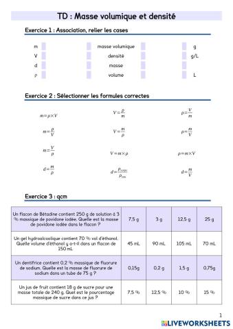 TD masse volumique densité pourcentages massiqus